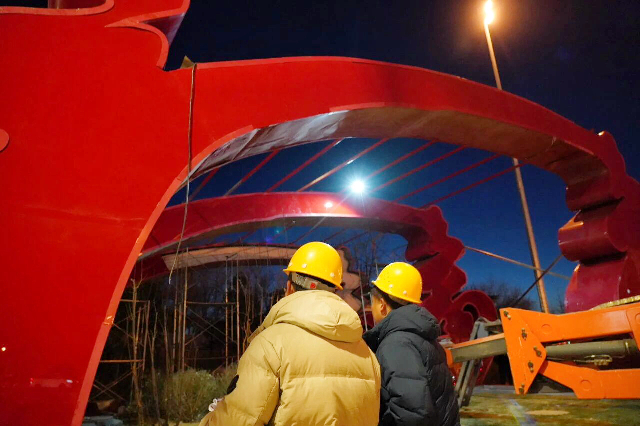 2月5日晚18时,寒风凛冽,在首钢厂东门,石景山区城市管理委景观建设管理中心项目负责人梁涛站在作业现场,目光紧盯着正在安装的“马跃新程-幸福之门”主题景观节点。