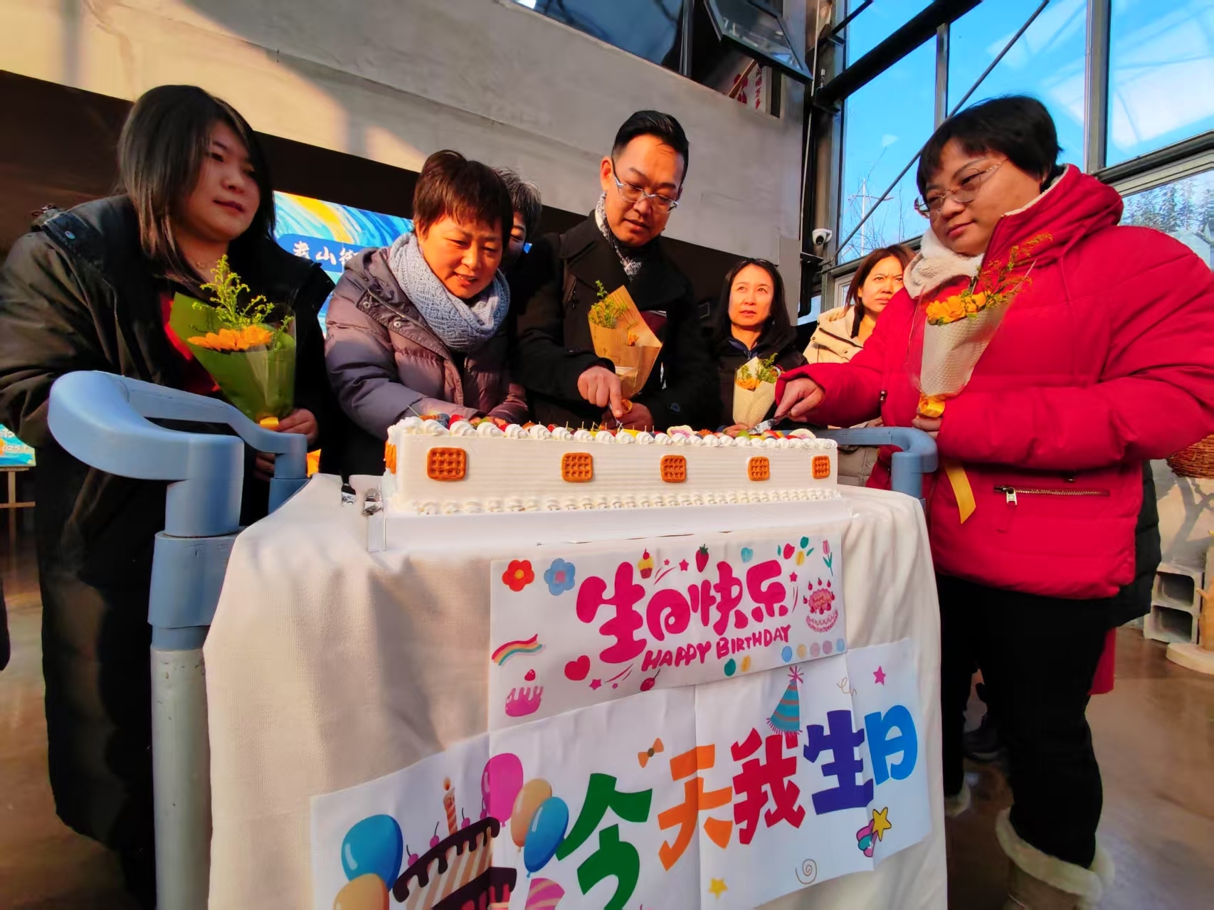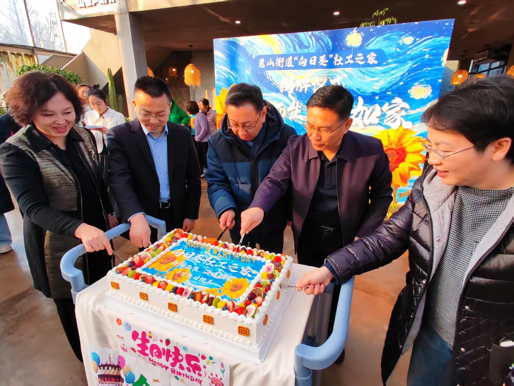 在集体生日会环节中,参加揭牌仪式的领导为本月过生日的社工切生日蛋糕,送上真挚祝福,现场气氛温馨而热烈。