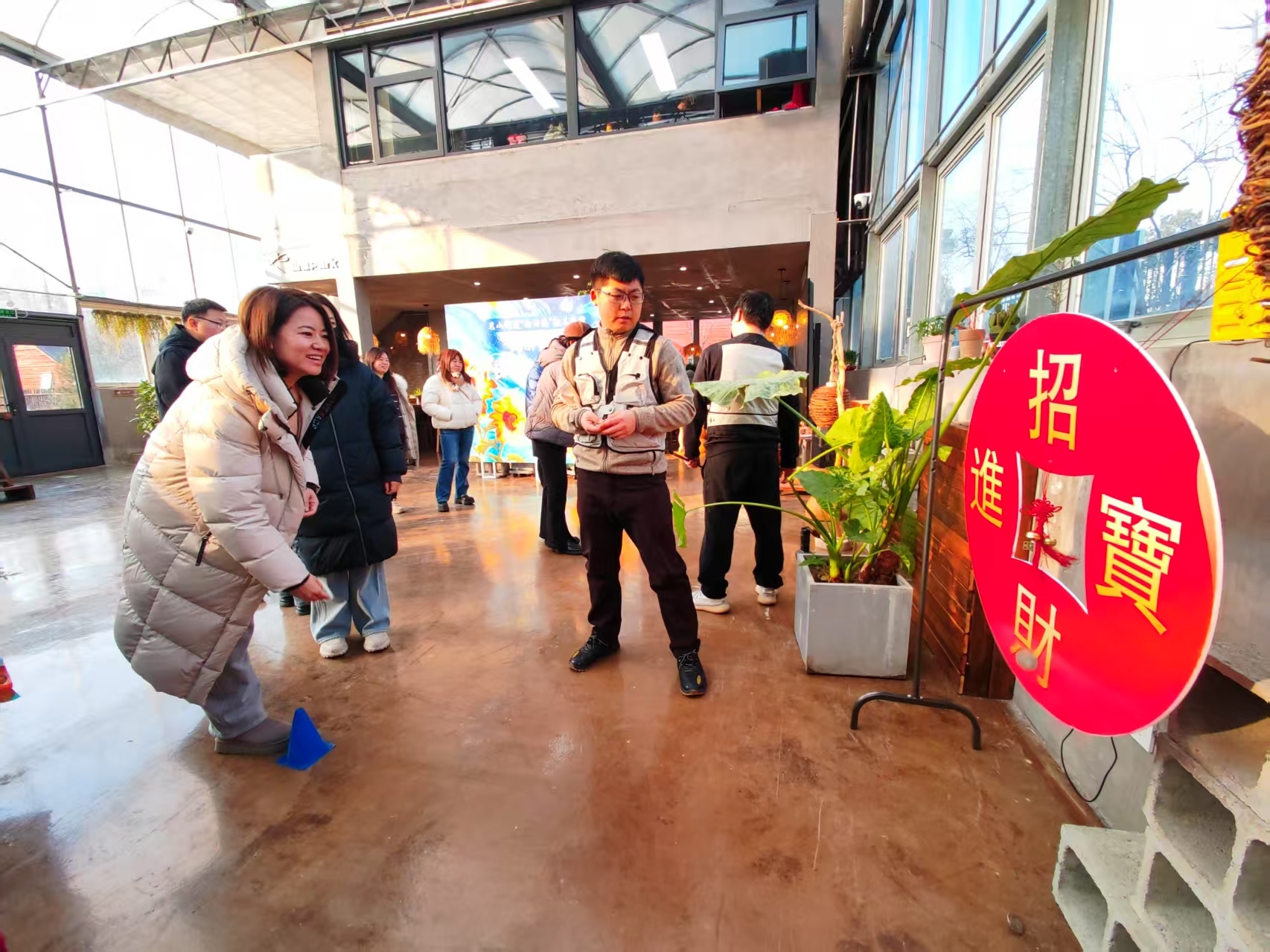 活动现场设置了传统投壶、幸运弹球、听歌识曲、招财进宝、原地踏步、瑜伽减压等趣味互动板块,50余名社区工作者踊跃参与其中。