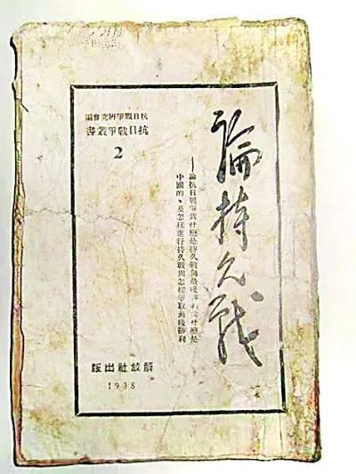 1938年7月,延安解放社出版了《论持久战》单行本。该版浅黄色封面,封面竖向题名“论持久战”,封面左下方署“毛泽东”。扉页有毛泽东的题词:“坚持抗战,坚持统一战线,坚持持久战,最后胜利必然是中国的。”此版《论持久战》是最早的单行本,非常珍贵。