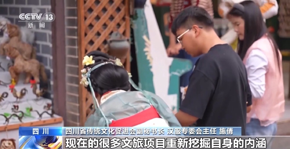 四川省传统文化促进会副秘书长 汉服专委会主任 施倩:现在的很多文旅项目重新挖掘自身的内涵,找到精准的定位“出圈”。所以我觉得汉服的复兴,它不仅仅是一件服饰重新回到了我们视野,它带动了我们华夏的文化以及我们东方的精神,重新回到了我们日常的生活里。