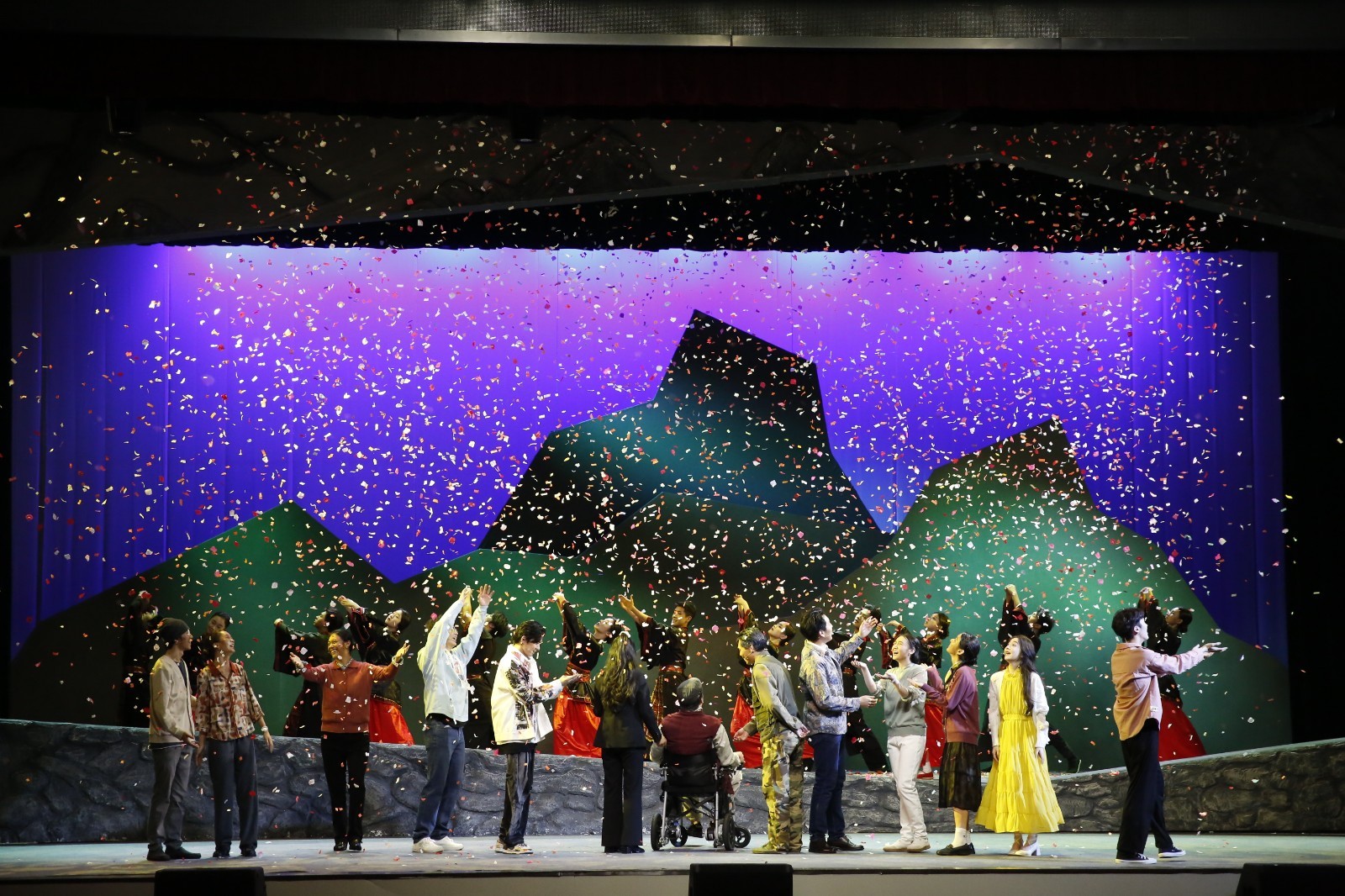 精心搭建的场景道具、光影变幻的舞美设计、别具匠心的舞蹈编排、鲜活灵动的角色演绎……《云间桃花烟火情》不仅运用AIGC技术制作了多段影像,用以还原剧中80年前的历史场景,让历史重现舞台;更在多维度不断突破创作瓶颈,开拓创作思路,生成更优质的舞美设计效果图、音乐等以达到更沉浸式的观演效果。