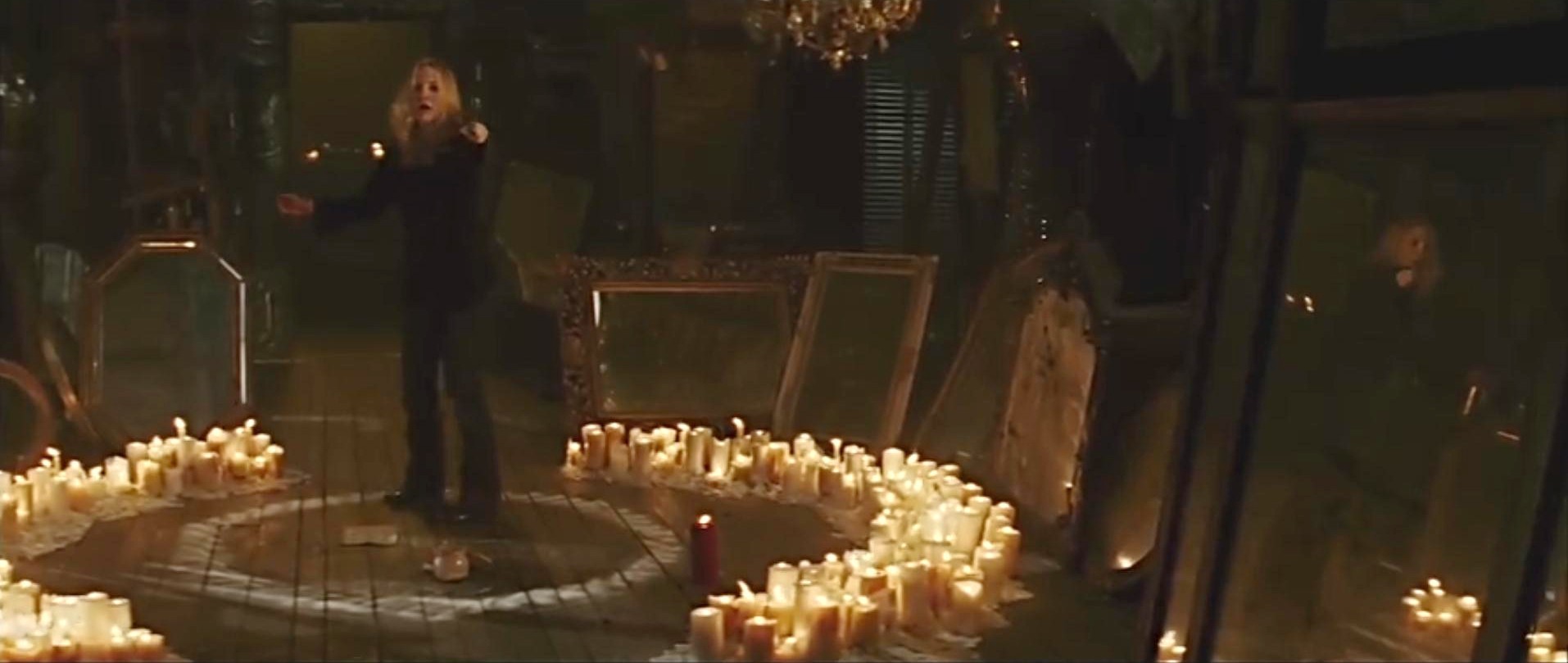 女主人站在一面镜子背后,施念咒语,镜中的人像在小女孩、黑仆人和女主人之间转换,最后镜子被卡洛琳周身产生的灵力吸引,一场“献祭”仪式结束。