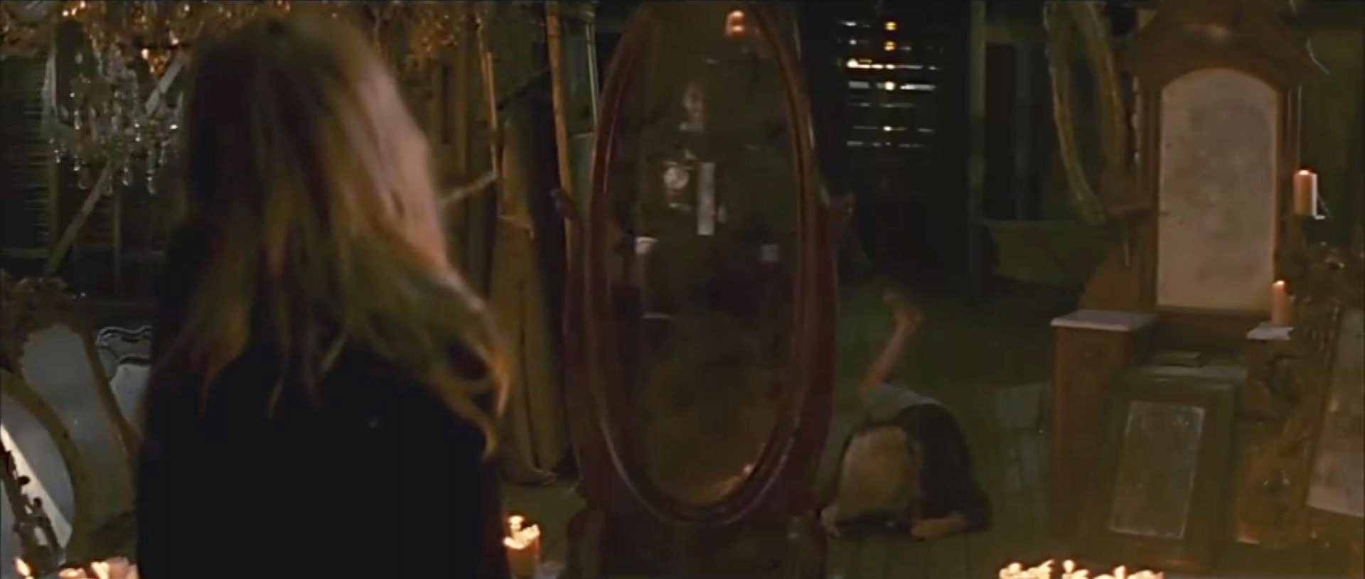 镜子在老话中是一个能通灵的媒介,巫术在实施的过程中也会用到镜子,在影片的结尾处,卡洛琳和女主人在阁楼做最后的对决,卡洛琳画下误以为是自保的符咒,周身围绕着这间屋子里所有的镜子;