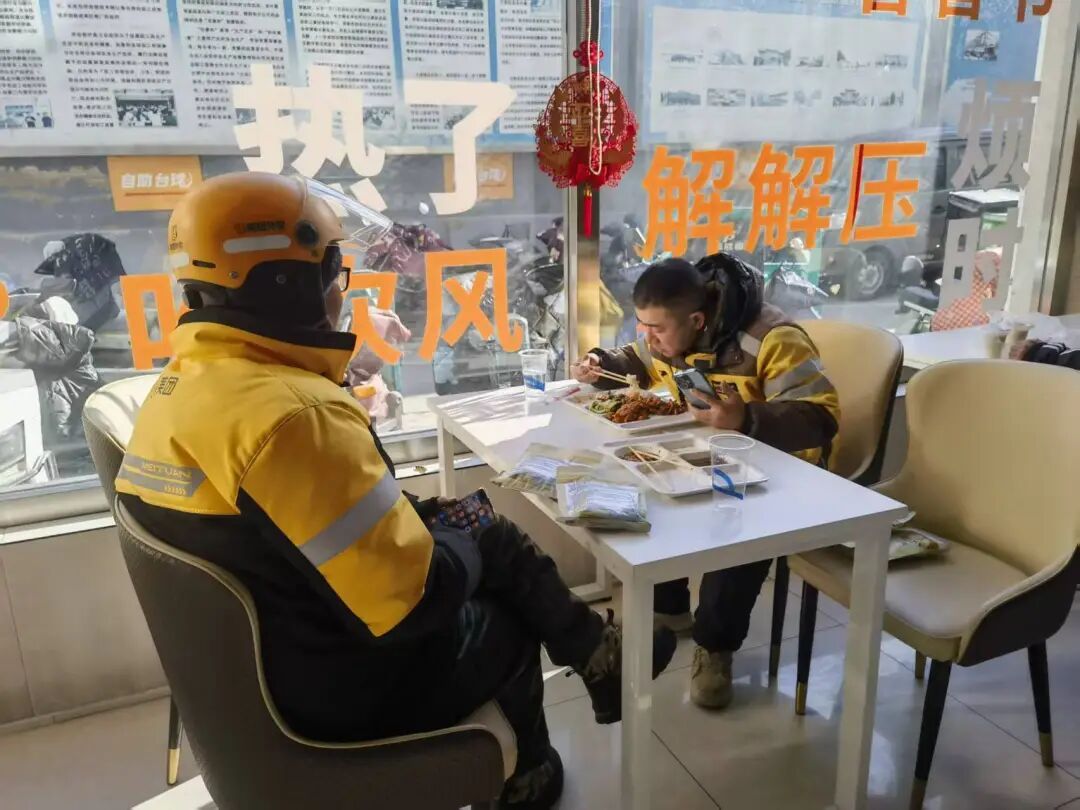 温暖不仅限于专属驿站。在热闹的商业街,由20家沿街商铺、银行网点与商场物业联合组成的社区联盟,依托常态化的“便民微站点”,将暖流融入日常烟火。这些小巧的站点安静守候,热水、座椅、充电插座、应急药箱一应俱全。多家餐饮店还自发推出米饭无限续的“小哥优惠套餐”。