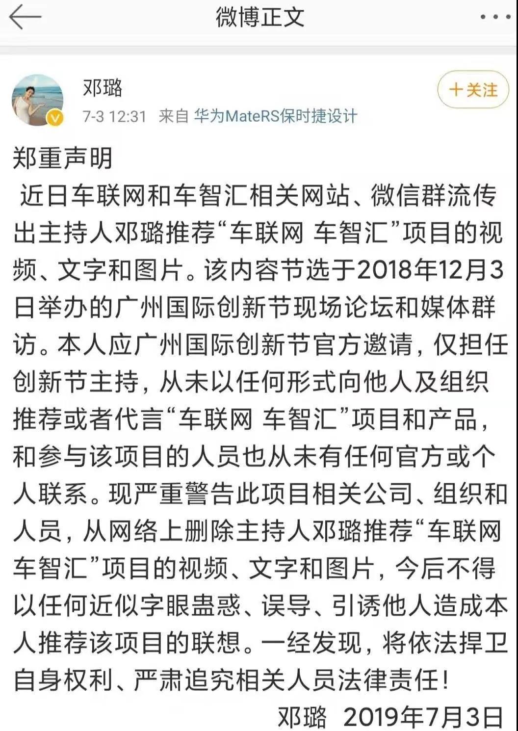 广东卫视中英文主播邓璐也于今年7月在微博公开否认了“推荐”车智汇一说。