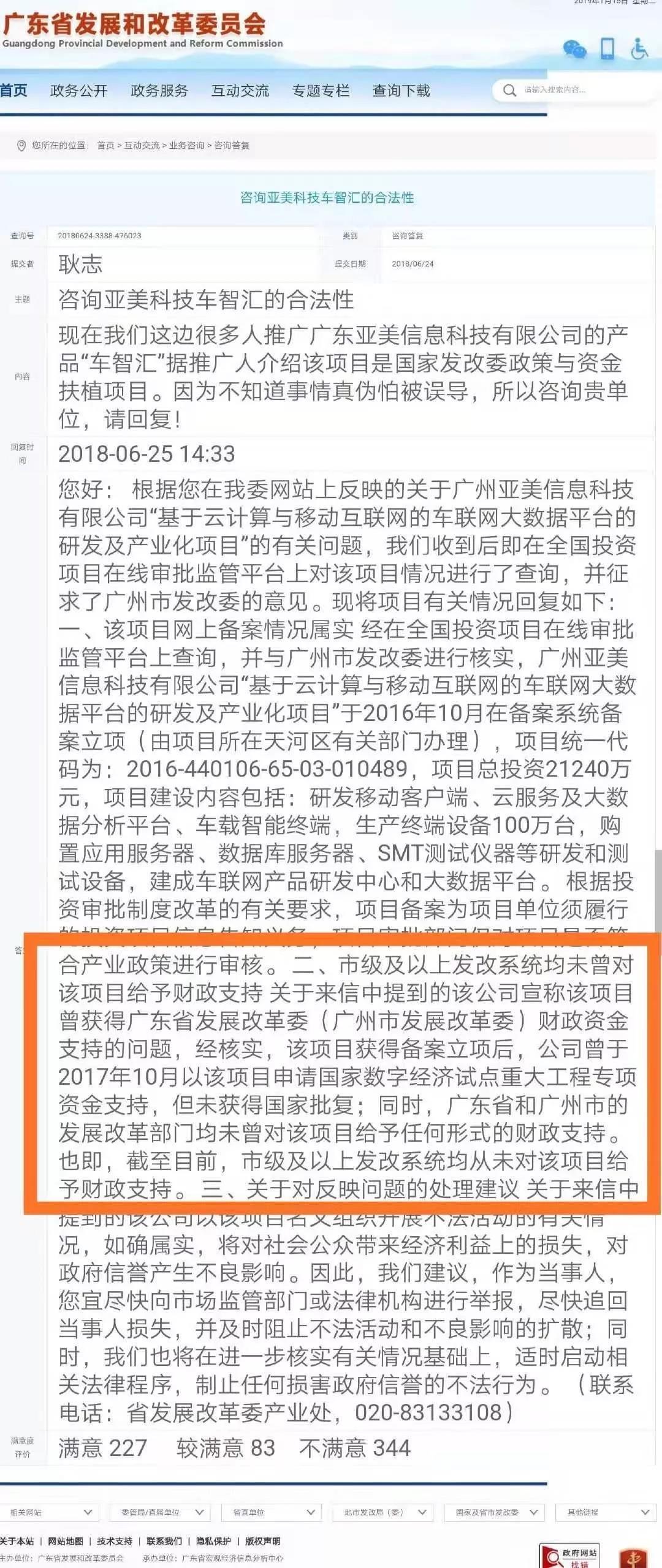 时间财经获得的资料显示,广东省发改委曾在2018年6月25日澄清称,车智汇项目获得备案立项后,曾申请国家数字经济试点重大工程专项发展资金支持,但未获得国家批复;广东省和广州市的发展改革部门均未曾对该项目给予任何形式的财政支持。截至当时,市级以上发改系统均未曾对该项目给予财政支持。此外,广东省发改委还在回复中称,会在核实的基础上适时启动相关法律程序,制止任何损害政府信誉的不法行为。