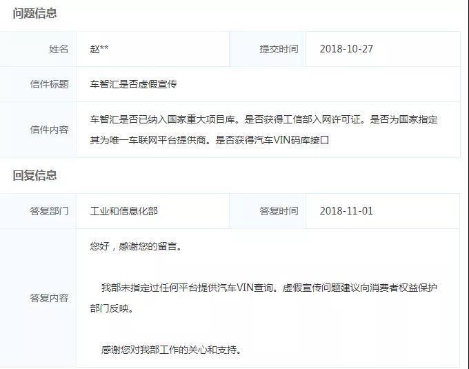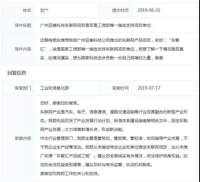 时间财经查阅工信部官网发现,工信部通过“部长邮箱”多次公开否认了车智汇或亚美科技及其相关公司受到工信部支持、车智汇是“国家重大项目”等传言。