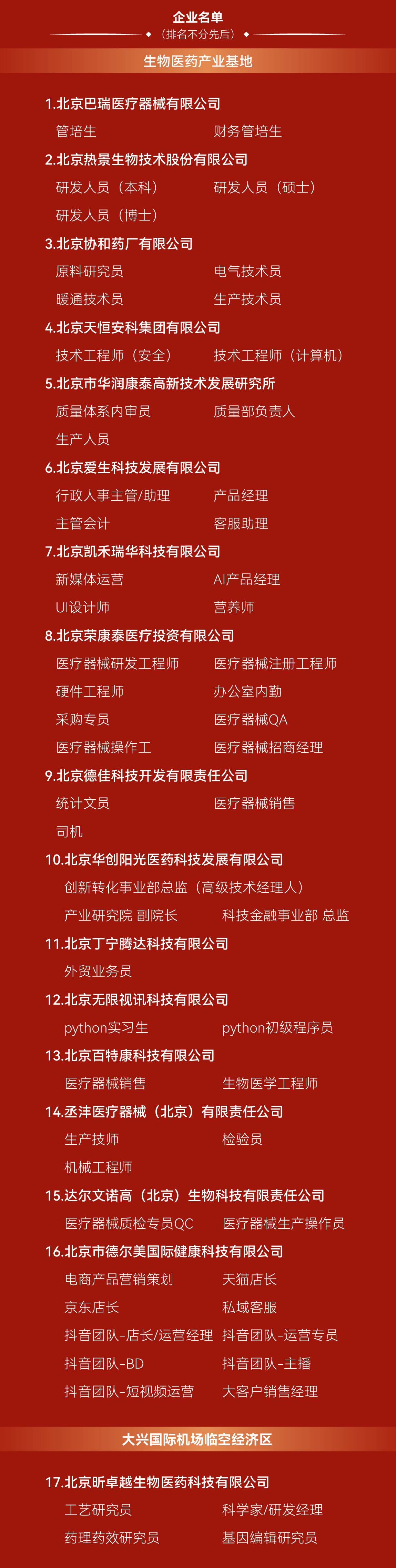 3月7日,大兴区人力资源和社会保障局组织“春风行动”专场招聘会,届时将有来自生物医药基地、数字经济示范区、临空经济区、氢能示范区、荟聚科技商务集聚区、协同发展示范区等区域的用人单位53家,以及人力资源、商业服务、家政物业等其他领域企业47家,为广大求职者朋友带来2000个就业岗位。届时,北京时间将推出现场直播,带你云上参与本次招聘会。
