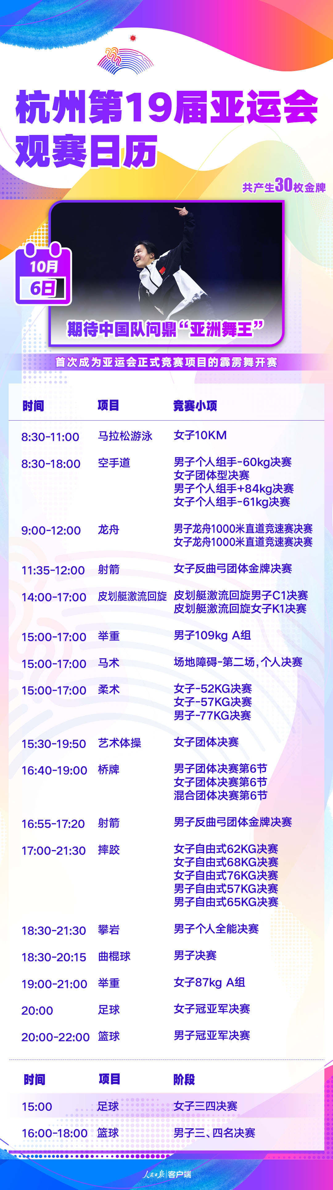 10月6日,杭州第19届亚运会接近尾声,随着赛程进行,又有一批项目将要进行角逐,当天将产生30枚金牌。中国女足、中国男篮迎来季军争夺战,能否站上领奖台充满未知。龙舟项目迎来收官日,中国龙舟队能否包揽全部金牌?霹雳舞首秀,“00后”小将冲击金牌。女排项目进入白热化阶段,中国女排挺进半决赛。这些看点,值得期待!