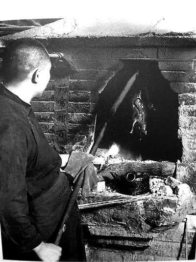 1933年,烤鸭业一代宗师张文藻在烤鸭。