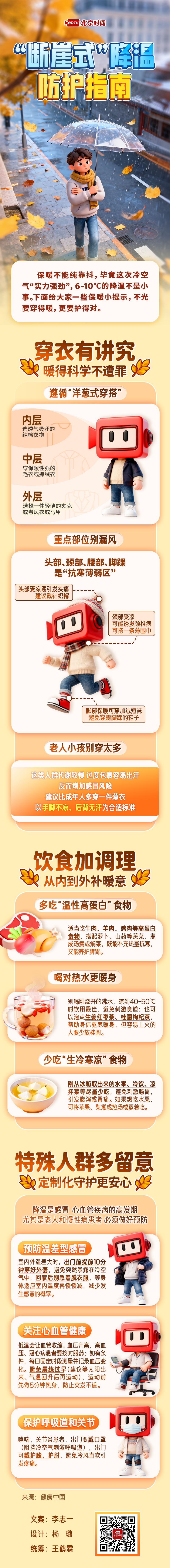 冷空气强势来袭,穿衣遵循“洋葱式”,重点护头颈腰脚;出门先适应温差,口罩护手霜也别忘;多吃温性汤羹,同时少碰生冷;老人、慢性病患者更要注意防感冒、稳血压。照着做,帮你和家人安稳应对降温!