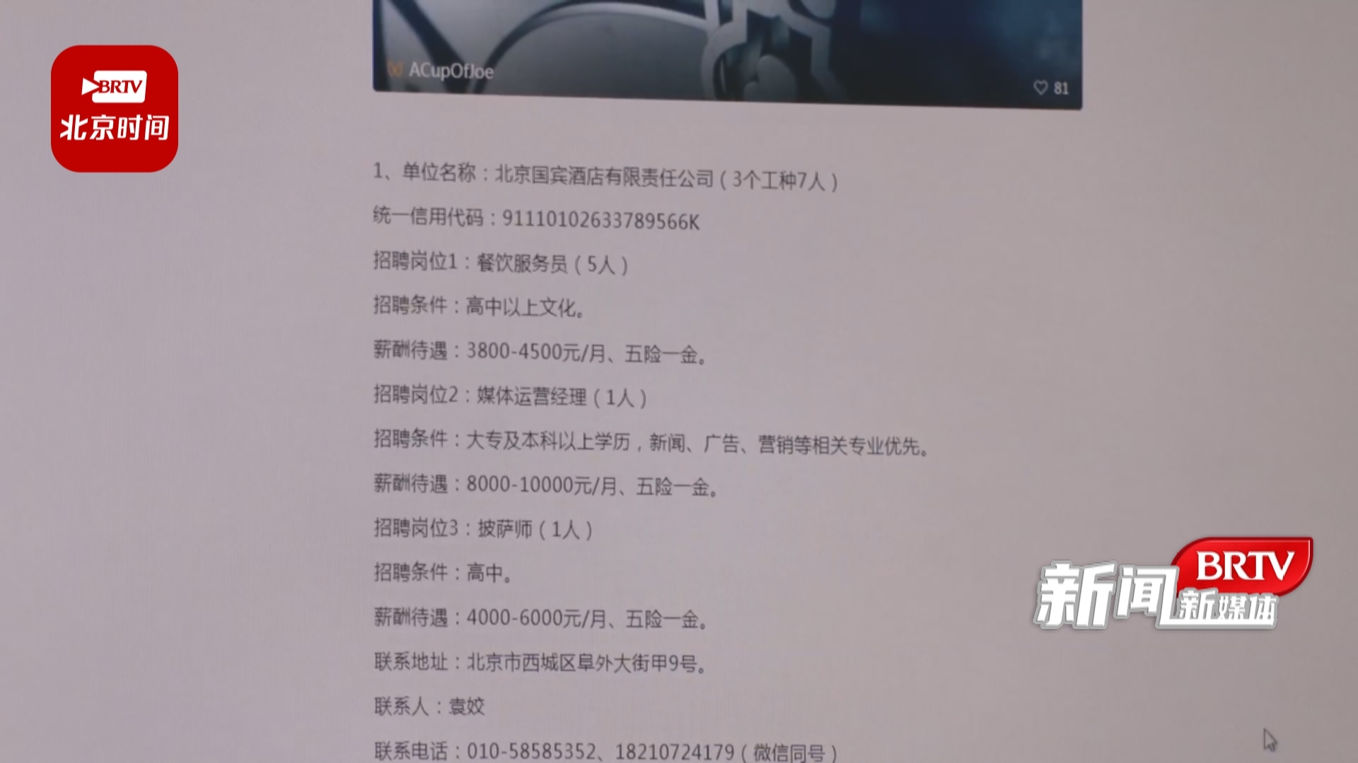 首开集团下属物业公司人力资源部经理张鹏:“我们是首开集团下属的一家物业公司,前一阵儿通过咱们东城人社一共发布了理发师、餐厅服务员、保洁等4个岗位,8个用人的需求。东城人社在接到我们的用人需求之后,大概两三天的时间就将(信息)发布到了东城人社的微信平台,大概一周左右(的时间)就收到了20多份求职简历,招聘效果对我们来说非常好。”