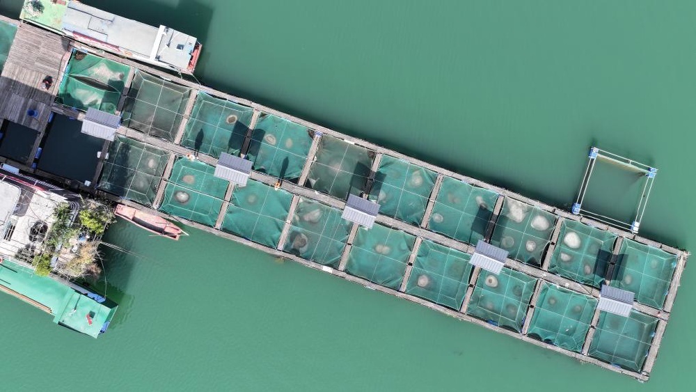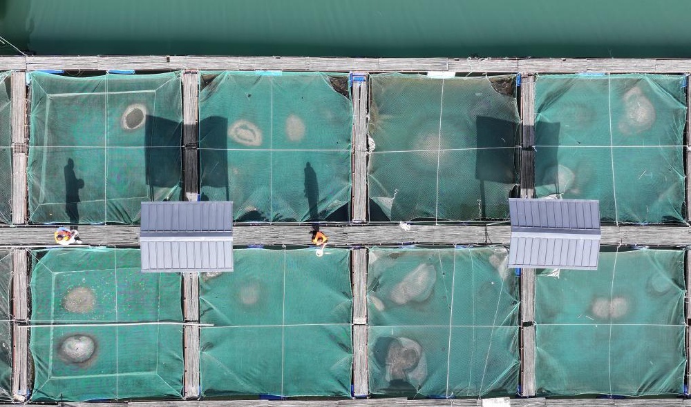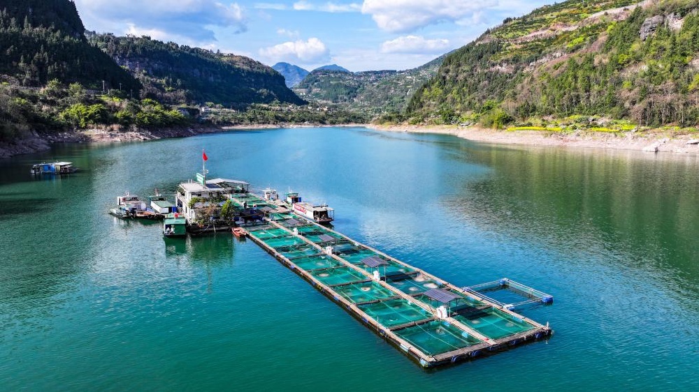 ▲3月9日,重庆市万州区水产研究所大周基地,工作人员在给鱼类喂食(无人机照片)。新华社记者 王全超 摄