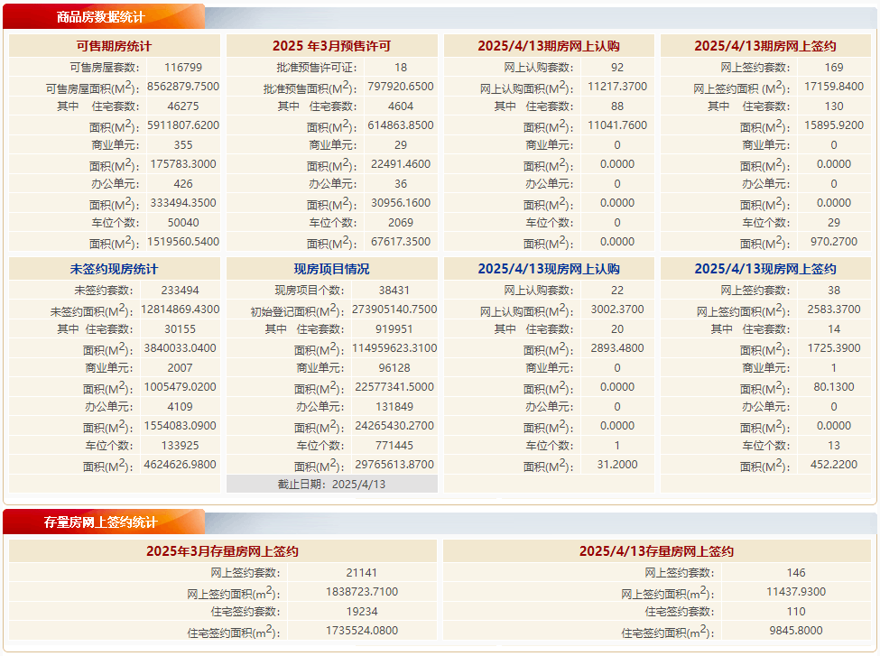 根据北京市住房和城乡建设委员会数据:4月13日,北京新房住宅网签144套,网签面积约17,621.31㎡;二手房住宅网签110套,网签面积约9845.8㎡。