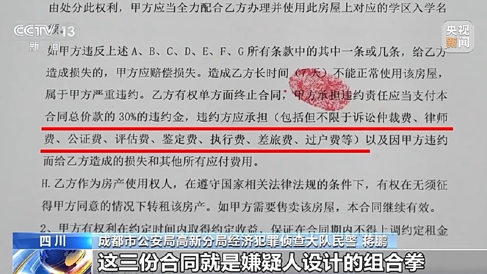 成都市公安局高新分局经济犯罪侦查大队民警 蒋鹏:这三份合同就是嫌疑人设计的组合拳。他们用低息贷款、固定租金做诱饵,把真正的陷阱藏在《房屋托管合同》和《授权委托书》里,表面看是商业合作,实则是用“租金+违约金”取代了传统的“砍头息+服务费”,把非法高息拆分成看似合法的条款。