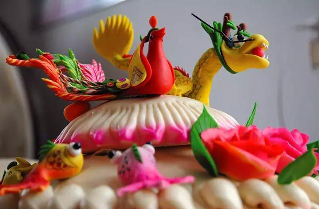 此外,玫瑰花、荷花代表爱情,牡丹花、菊花代表富贵。梅花配小鸟代表喜上眉梢,荷花配鸳鸯代表百年好合,牡丹配凤凰代表花开富贵,菊花配蝴蝶代表吉祥长寿等。漂亮的面花配上文雅的名字,可谓锦上添花。“龙腾凤舞”“鲤鱼穿荷花”“牛郎和织女”等各式各样的花饽饽,饱含着人们对生活的美好祝愿。