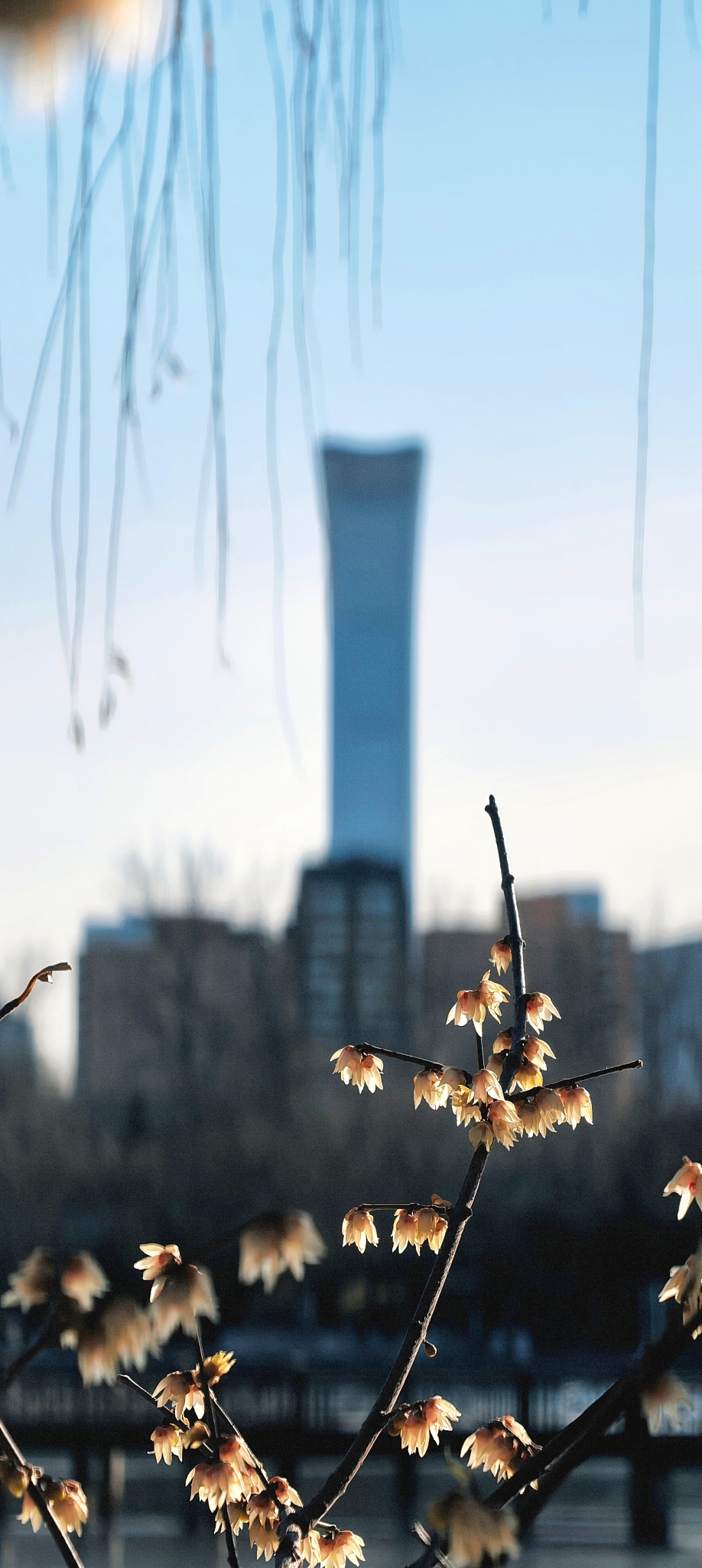 今日迎小寒节气,漫步北京农展馆后湖,寒波如镜,映着梅枝。