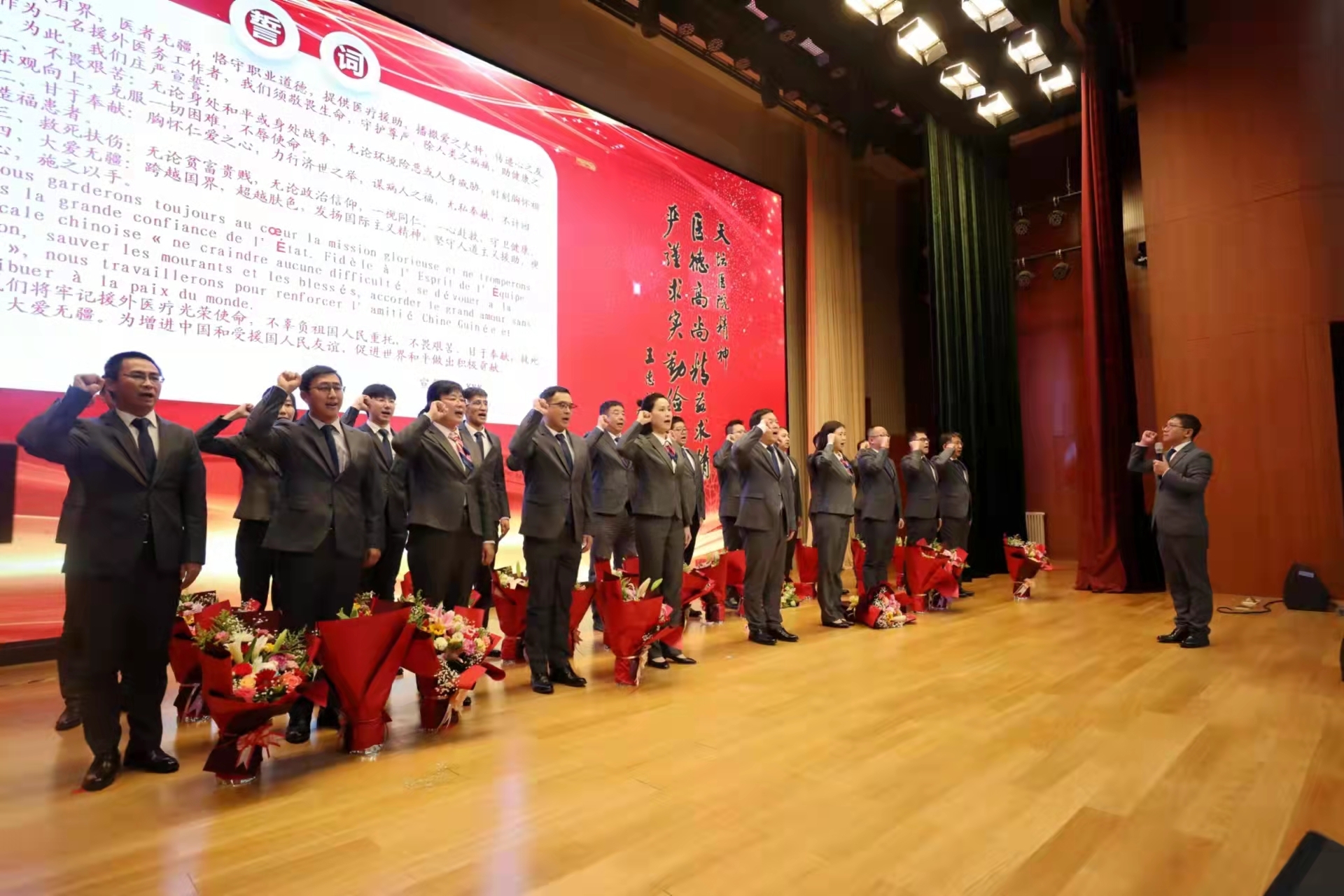 授旗仪式上,参会领导向医疗队队员献花,北京市卫生健康委员会党委书记、副主任钟东波向医疗队授党旗,国家卫生健康委国际司领导向医疗队授队旗,北京天坛医院王拥军院长向医疗队授医院院旗;全体队员宣读援外医疗队誓词。