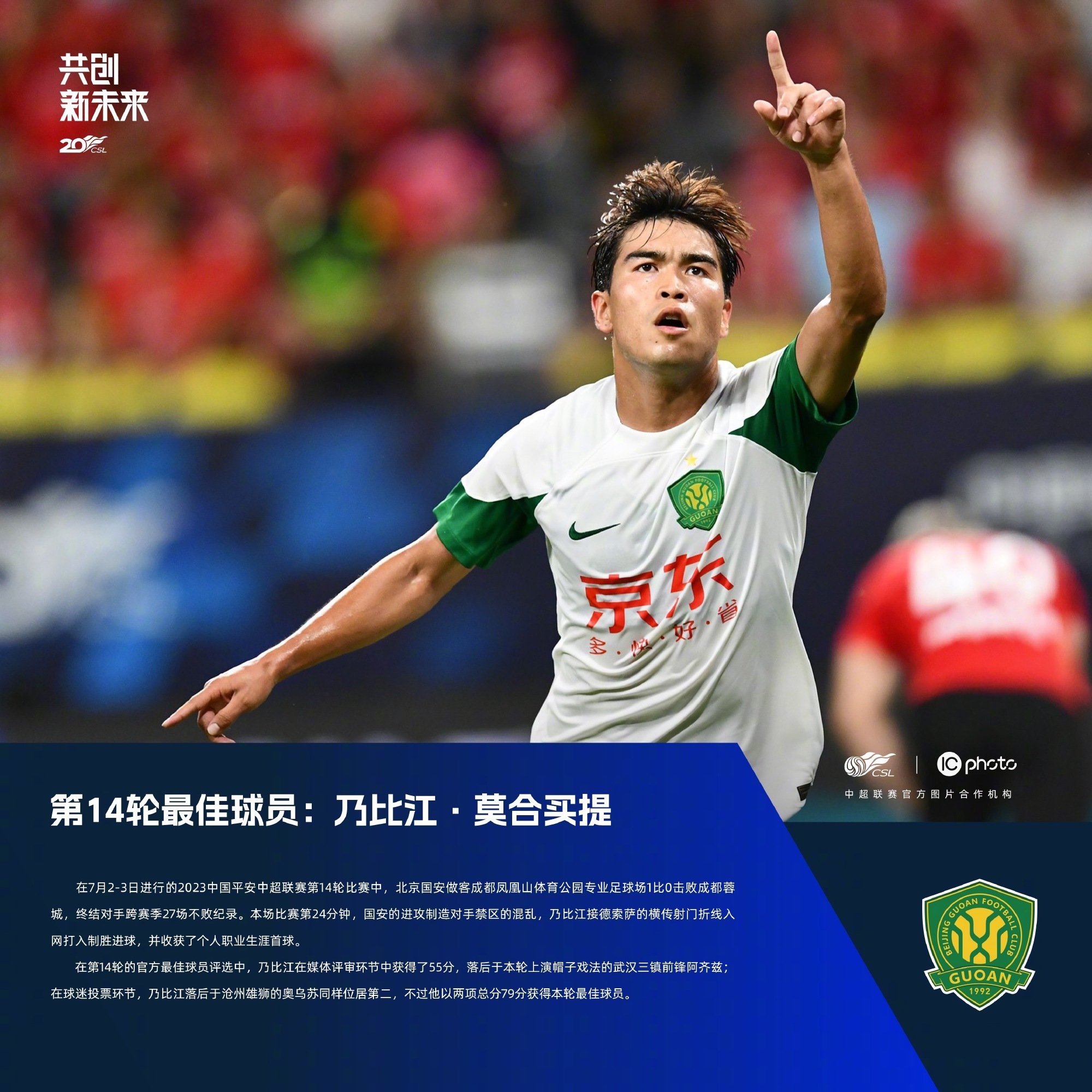 在7月2-3日进行的2023中国平安中超联赛第14轮比赛中,北京国安足球俱乐部做客成都凤凰山体育公园专业足球场1比0击败成都蓉城,终结对手跨赛季27场不败纪录。本场比赛第24分钟,国安的进攻制造对手禁区的混乱,乃比江接德索萨的横传射门折线入网打入制胜进球,并收获了个人职业生涯首球。