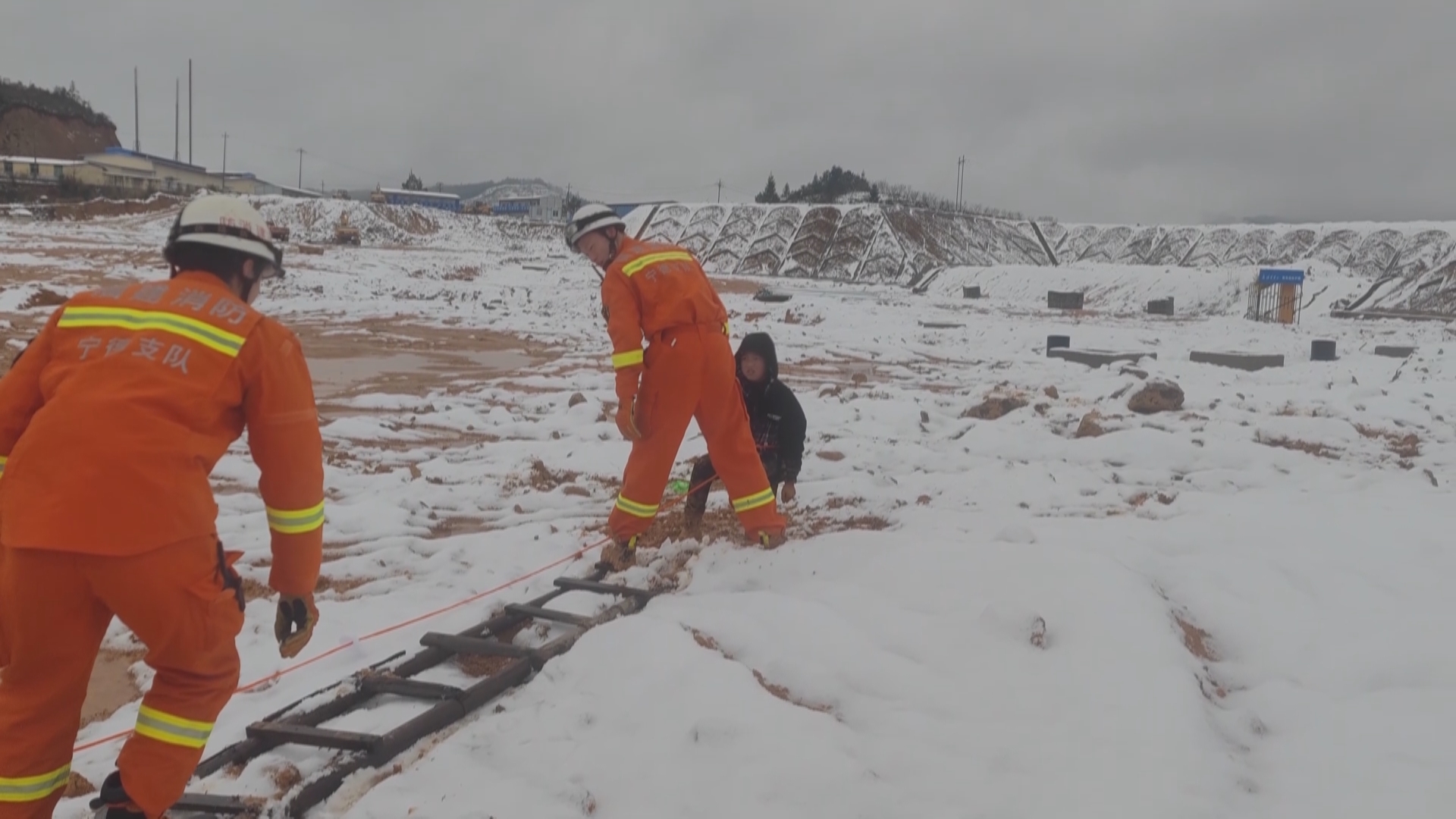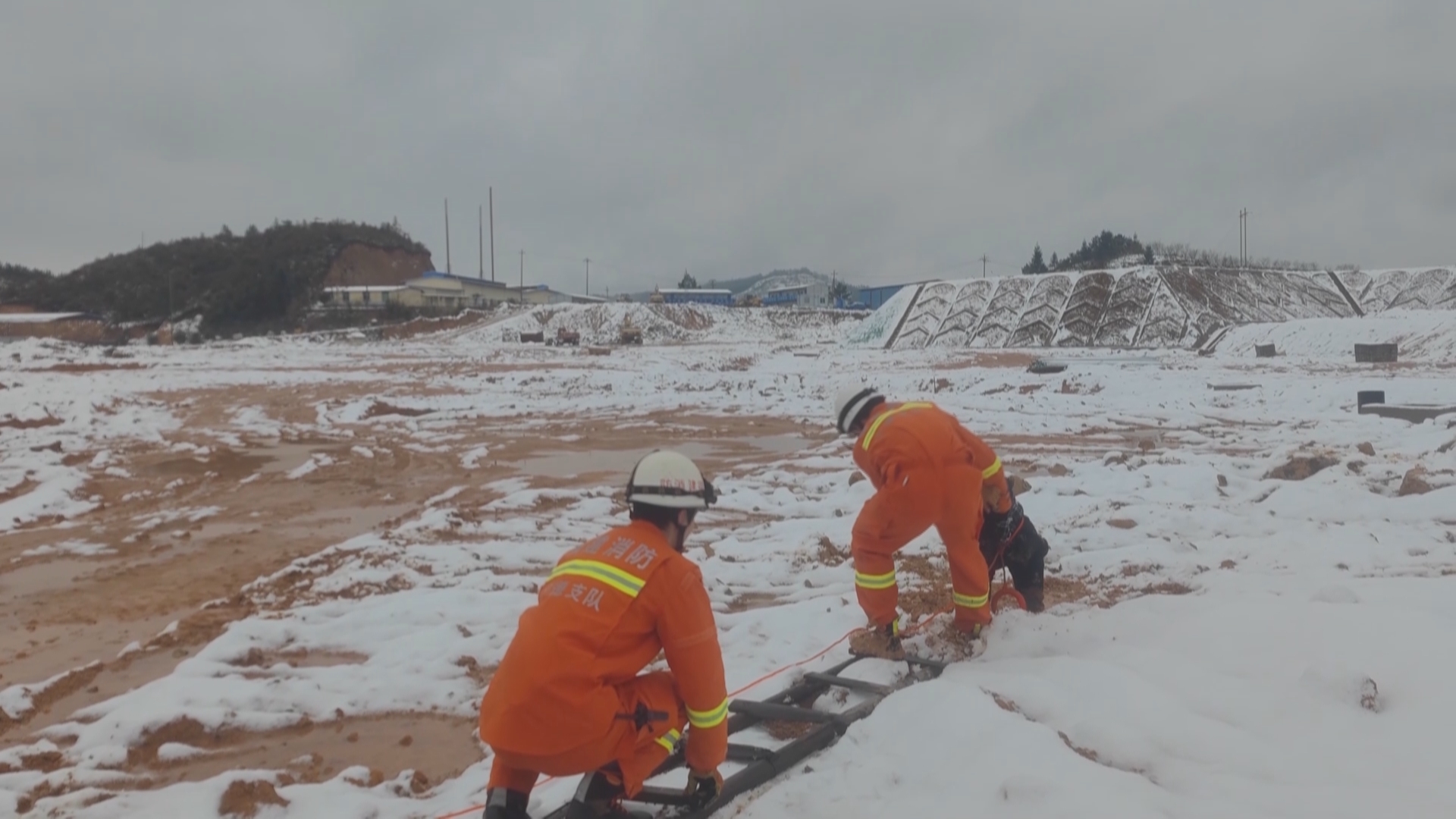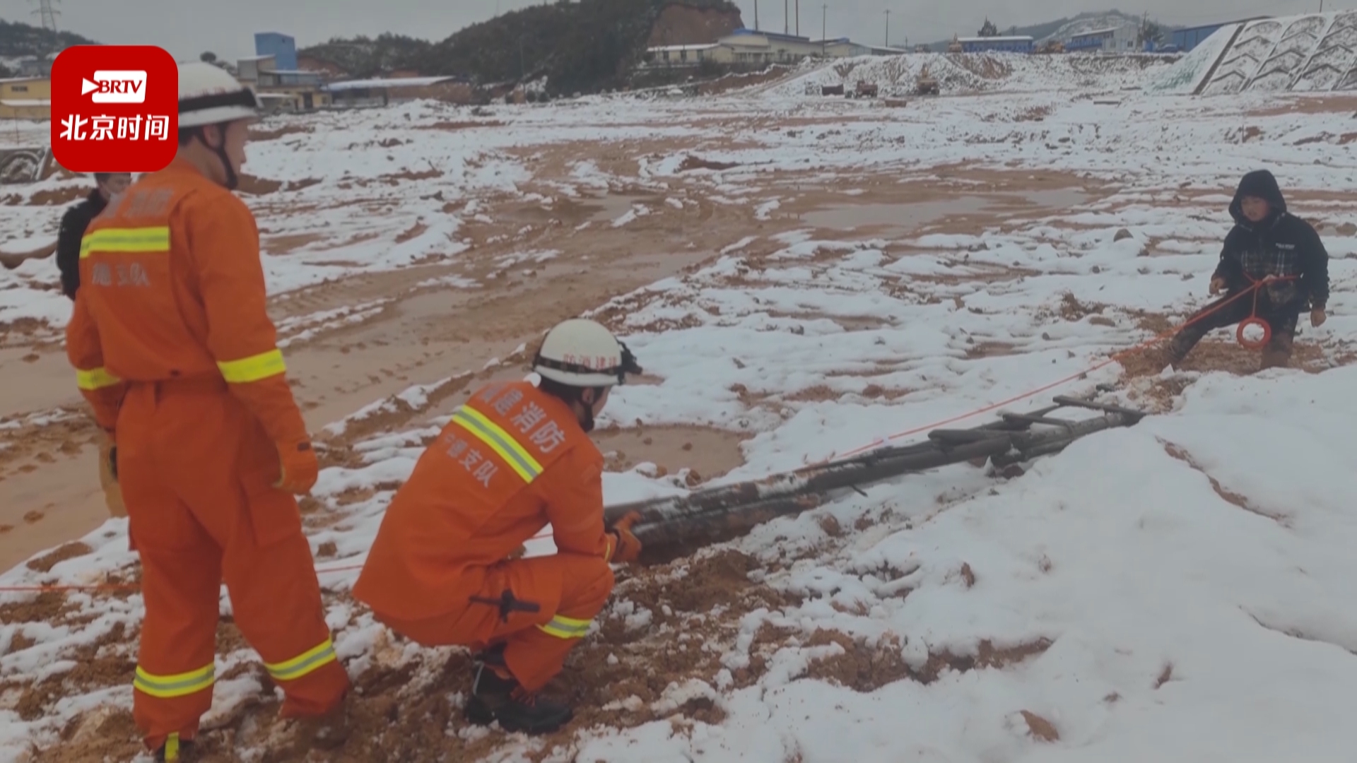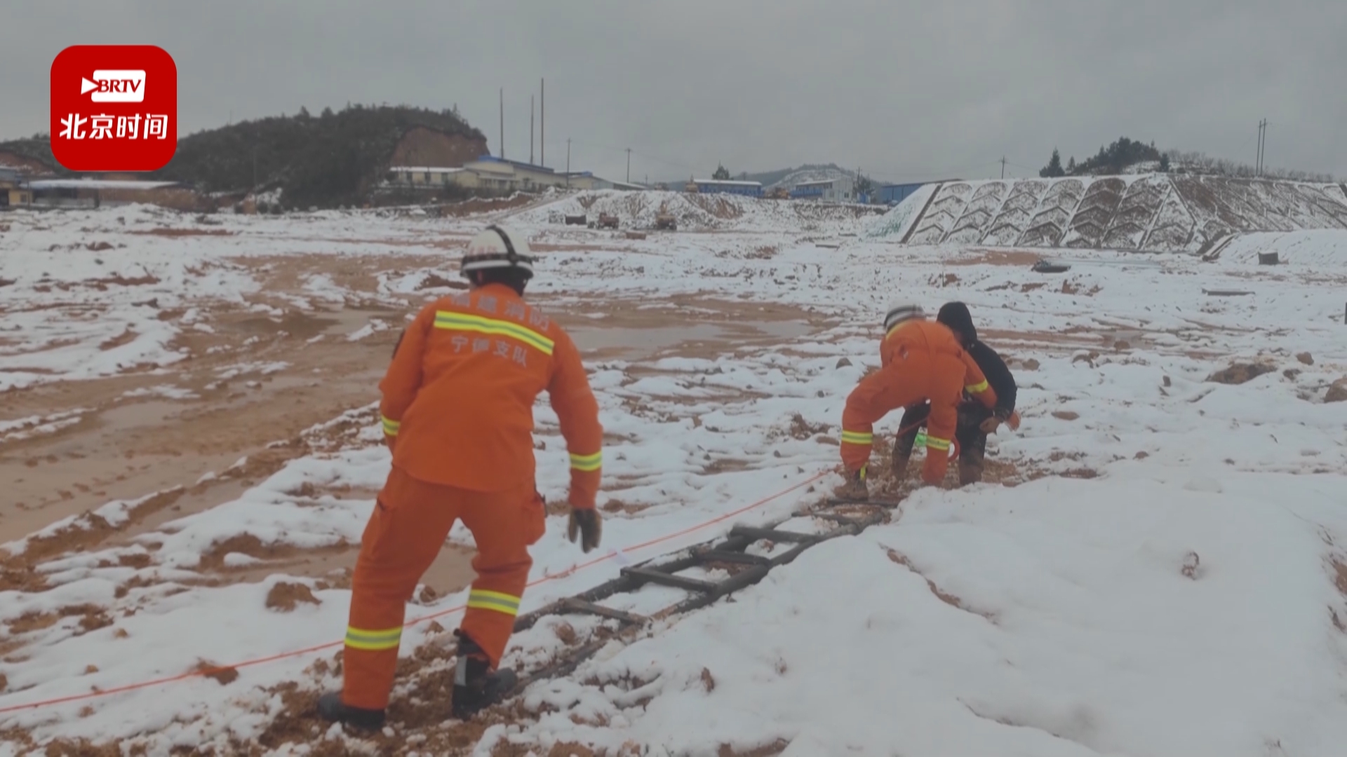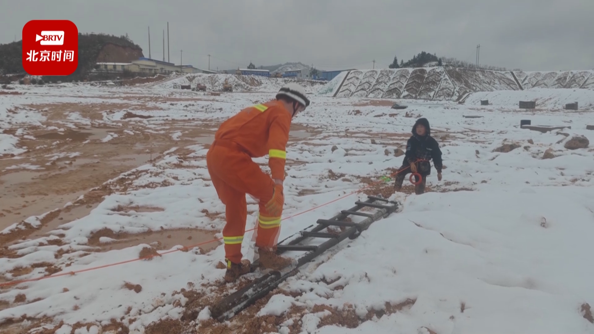 到达现场后,消防员发现,由于昨夜下雪,周边的泥土被融化后的雪水打湿,形成了柔软的泥潭,而小孩的脚已经陷入其中。经过观察,小孩位于泥潭中央,周围没有支点,消防员随即决定设置安全牵引绳,做好保护,并铺设梯子,通过梯子靠近被困小孩。
