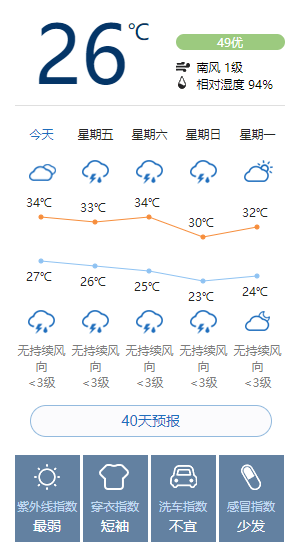 今天白天晴转多云,山区有雷阵雨,南风二三级,最高气温34℃;