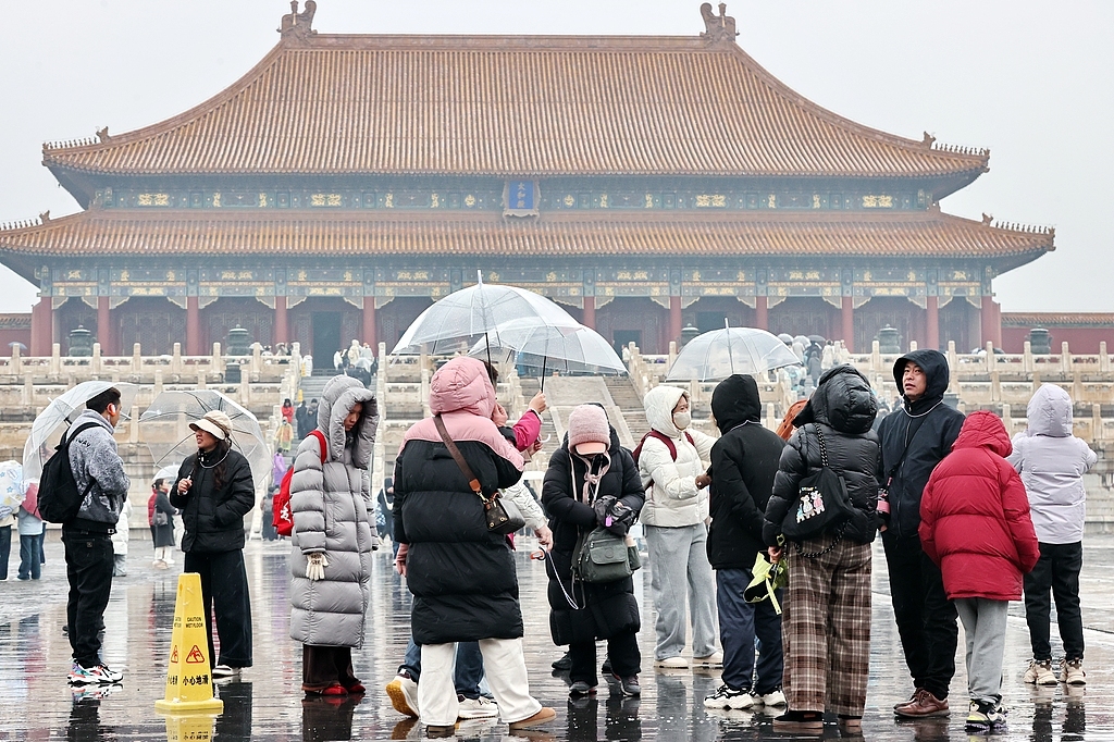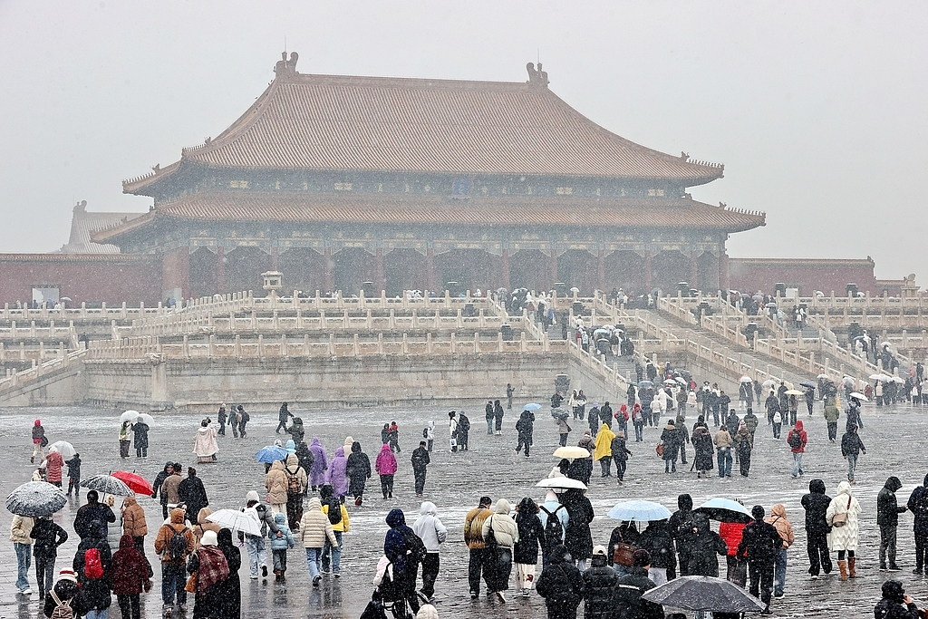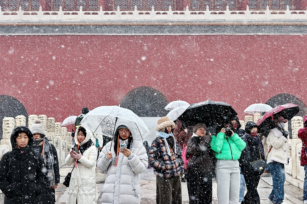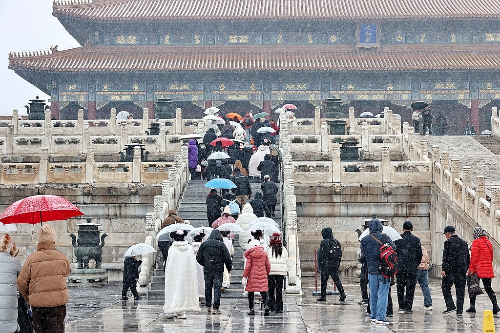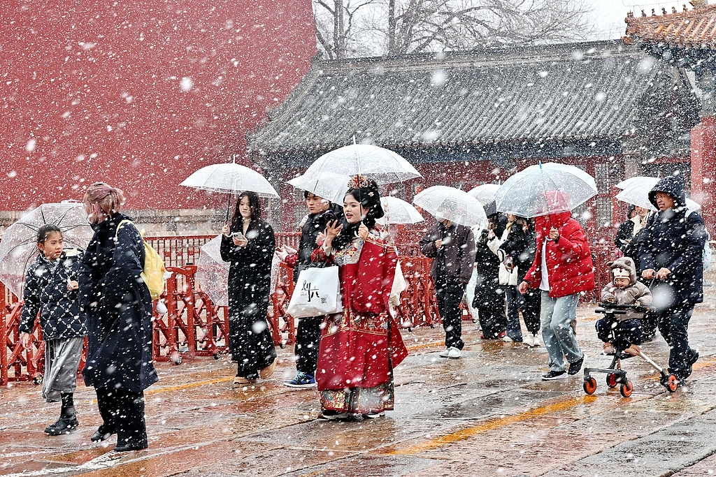 2026年3月4日,一场降雪造访北京,市民游客冒雪游览故宫博物院。尽管气温骤降、体感阴冷,大家赏雪的热情始终不减。