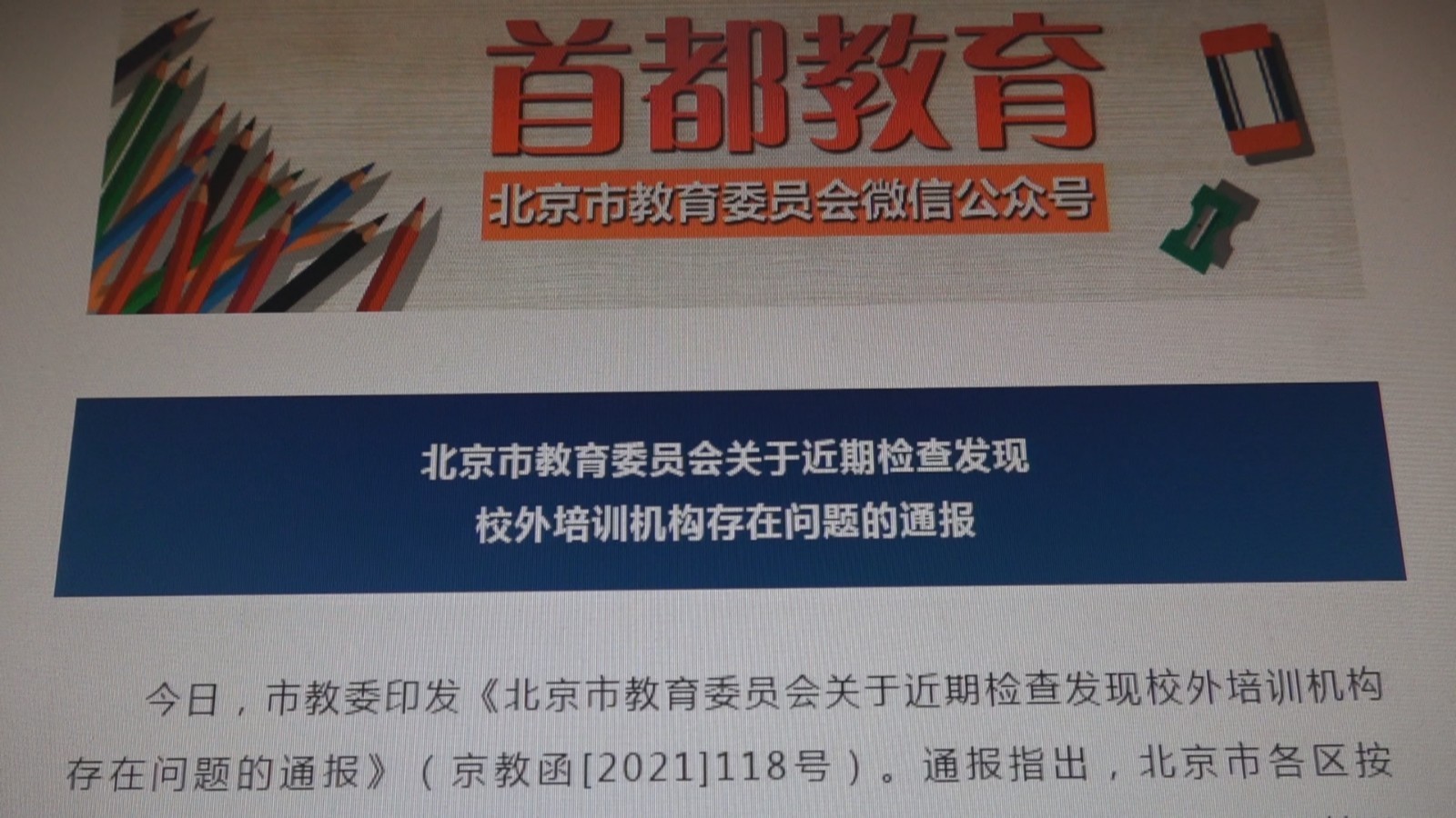 今日,市教委印发《北京市教育委员会关于近期检查发现校外培训机构存在问题的通报》(京教函[2021]118号)。通报指出,北京市各区按照“坚持标准、严格程序、规范审核”的基本原则,有序恢复了一批校外培训机构的线下教学活动。为督促指导已恢复办学活动的校外培训机构依法依规诚信办学,市教委继续加大工作力度,通过“双随机一公开”执法检查,持续深化校外培训机构规范治理效果。在近期开展的执法检查中,相关区部分恢复线下教学活动的校外培训机构被发现仍存在不符合工作规范要求的问题,现将相关问题进行通报。