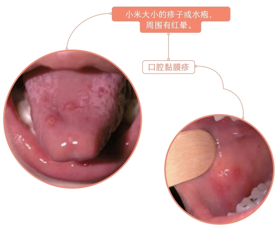 口腔黏膜疹:舌头及口腔黏膜出现小米大小的疹子或水疱,周围有红晕。