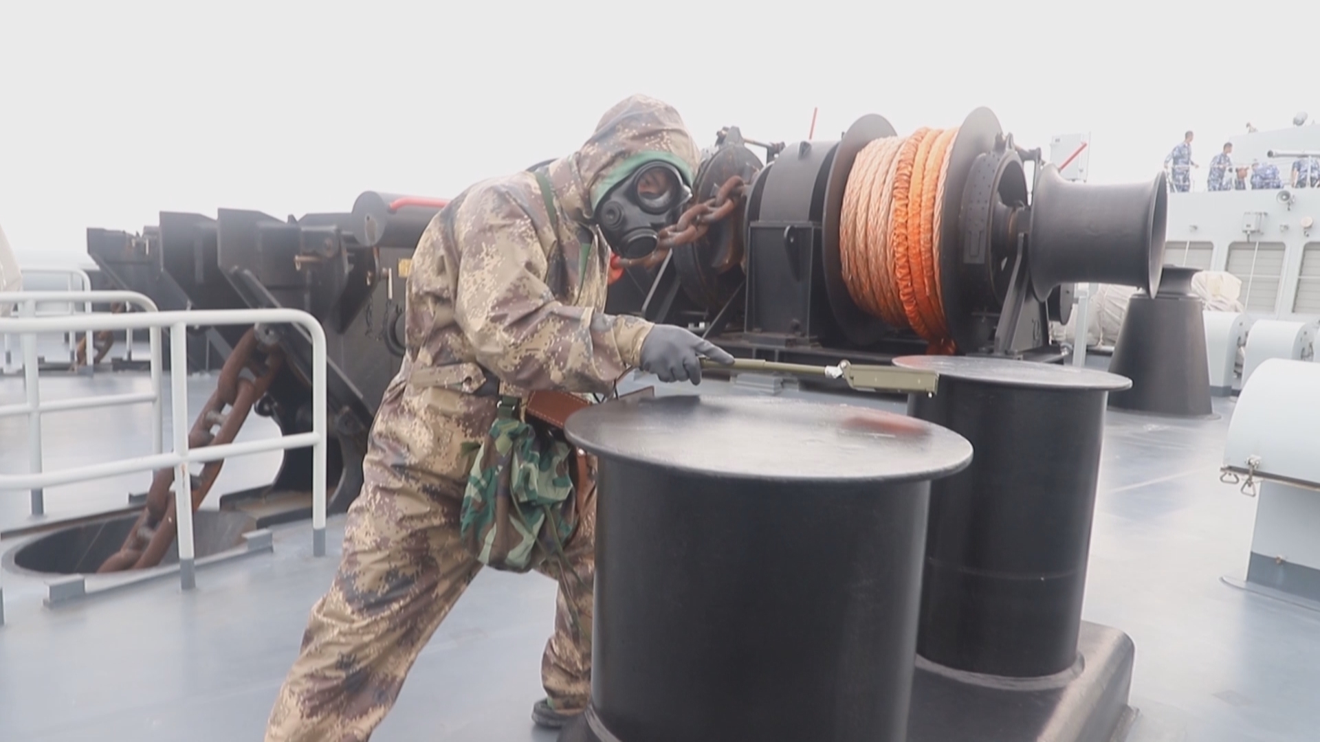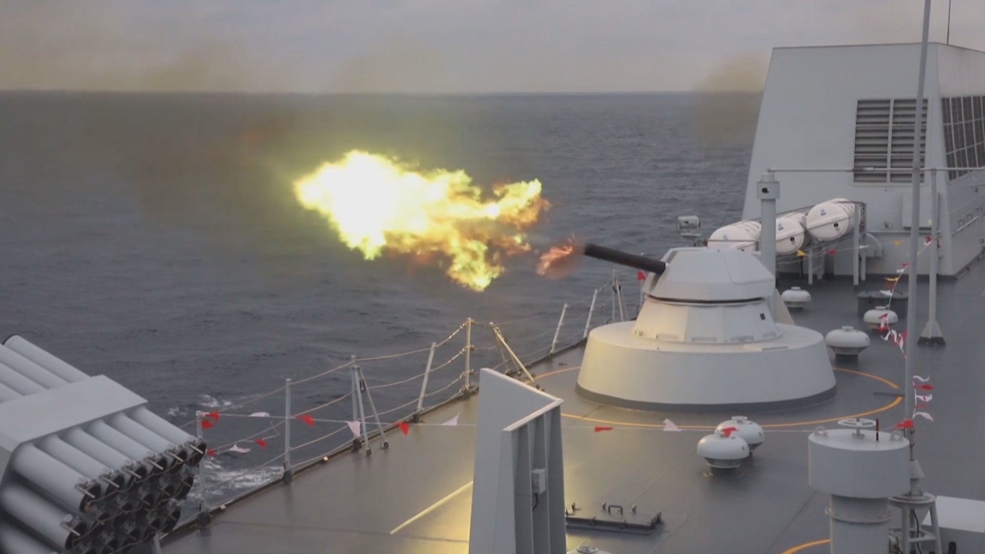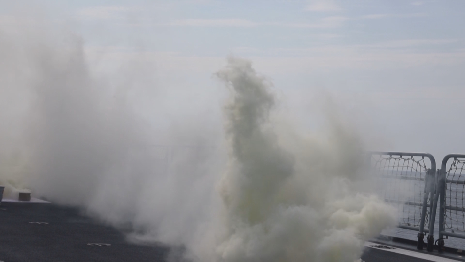 由于自身位置已经暴露,祁连山舰摧毁来袭导弹后迅速下达命令施放固定烟幕,浓烟随着风向遮蔽船体,在掩护下祁连山舰加速撤离赶往下一训练海区。为期五天的多科目高强度演练对新入列的舰艇和接装的官兵们来说是一次不小的挑战,祁连山舰先后完成了舰炮实弹射击,防空反导,航行补给等科目,扎实锤炼官兵操作武器装备的能力,提升打赢的硬功夫。
