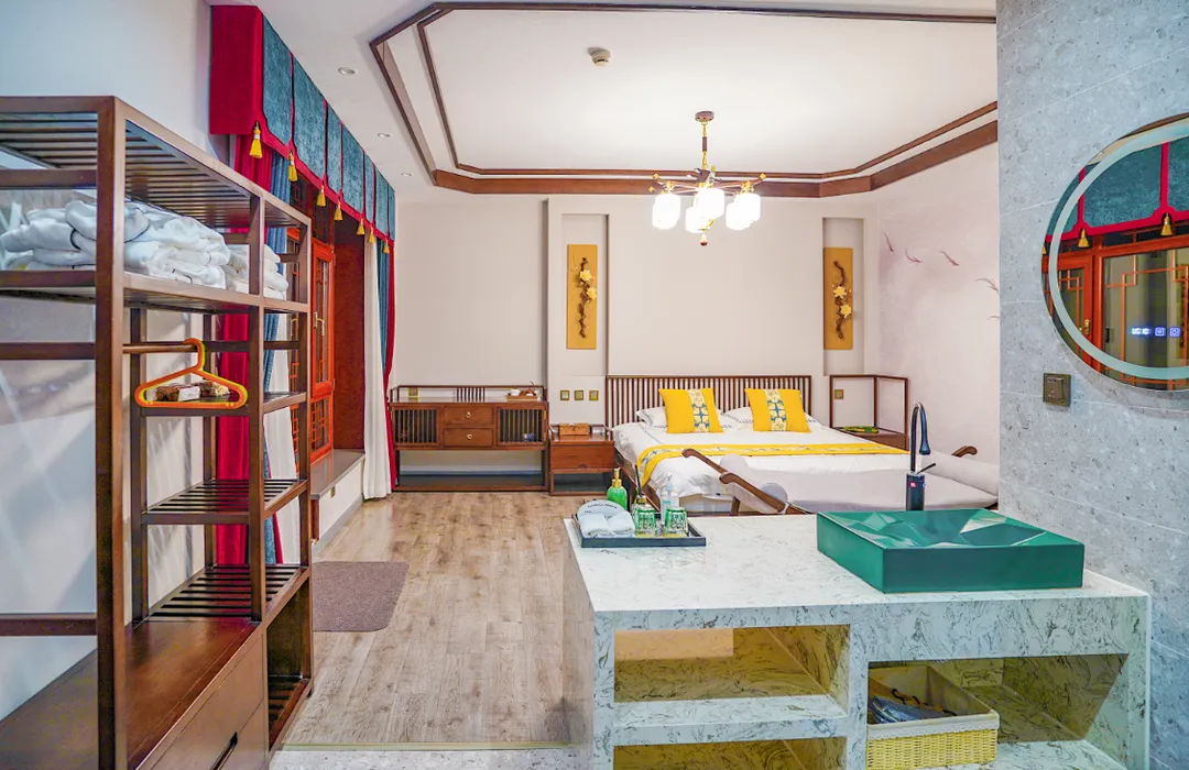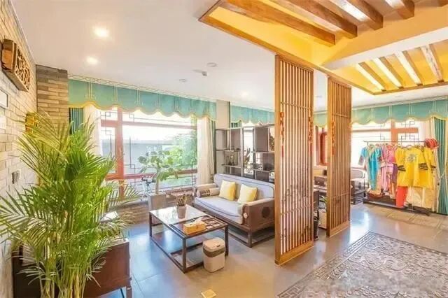 民宿建筑面积近1000平方米,最多可接待35人,8间客房均巧妙融合传统民族风格与现代中式元素。青砖灰瓦的院落格局、窗棂上的民族吉祥纹样、室内陈列的八旗文化摆件,让古朴韵味与现代舒适完美交融。