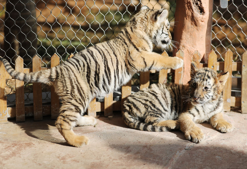 ↑1月29日,在青岛森林野生动物世界,两只小老虎在嬉戏。