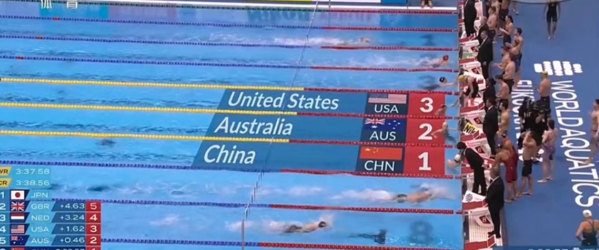 中国队的最后一棒自由泳,是江西选手程玉洁。在澳大利亚队和美国队的全力追击下,程玉洁顶住了巨大压力,最终第一个到边!中国队的最后成绩是3分38秒57,为中国代表团取得了7月26日晚的第二枚金牌。