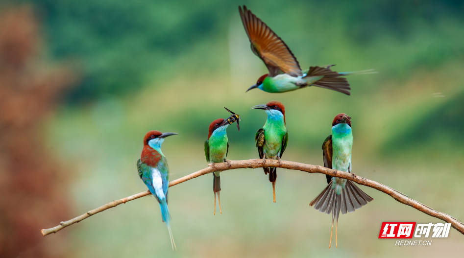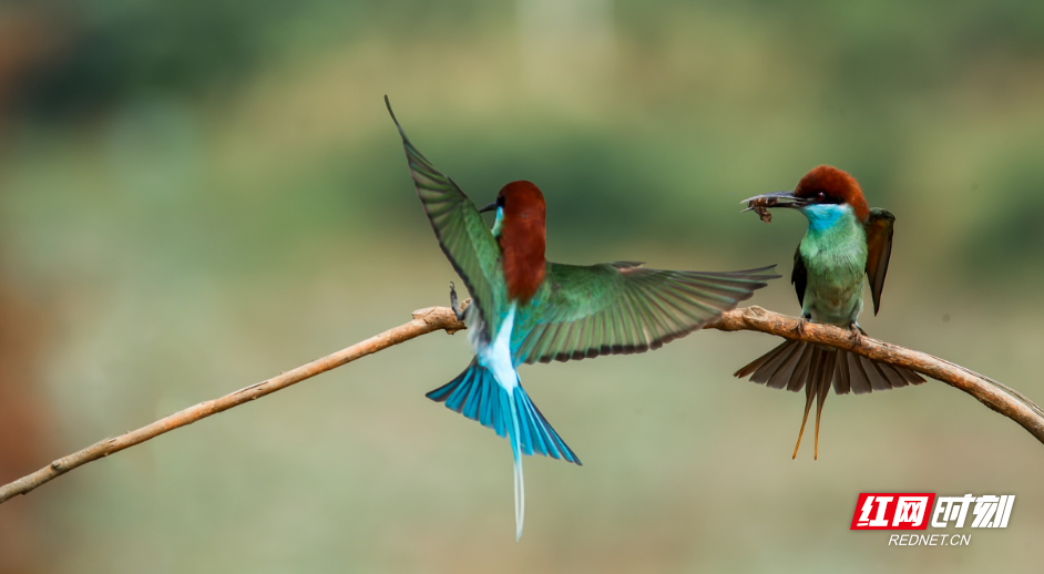 蓝喉蜂虎的羽色极为漂亮,同时它的飞行动作变幻繁多,按下快门就是精彩瞬间,因而深受鸟友喜爱,被称为“中国最美小鸟”。