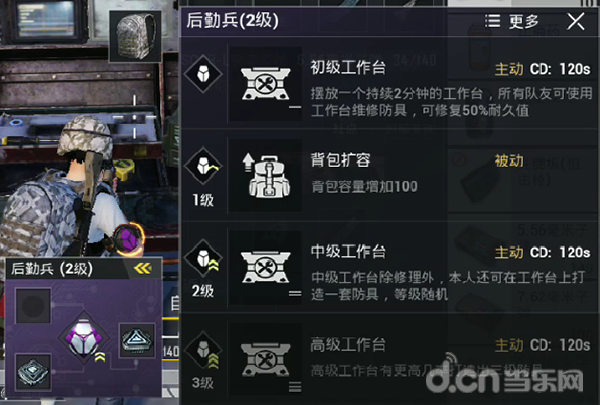 后勤兵最大的功能在于升到三级后的“高级工作台”能打造出三级防具,如果队伍中人手都是三级防具可以极大提升队伍整体的容错率,作战能力也会比别人强。建议后勤兵可以在后期换掉,因为在紧张的决赛圈里根本没有时间和位置给大家修理装备。