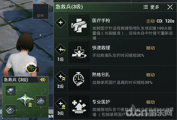 一级技能手动救援会缩短30%的时间,二级技能是自己在使用医疗道具时会缩短30%的时间,在对拼时每一秒都非常宝贵,节省时间可以做更多其他方面的准备。三级技能是在救援倒地队友时可以让其在起身时快速获得50点健康值。