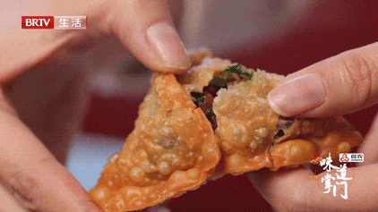 这个时候的焖子还是流体状态,经过两三个小时的静置,会变成半透明的状态。然后加胡萝卜丝、芥菜丝、香菜,和焖子一起调和,讲究“诸香不露头”,各种味道都有,但是每一个味道都不突兀。最后用面皮包成三角形,炸出小气泡,吃起来馅儿香,皮酥,非常特别。