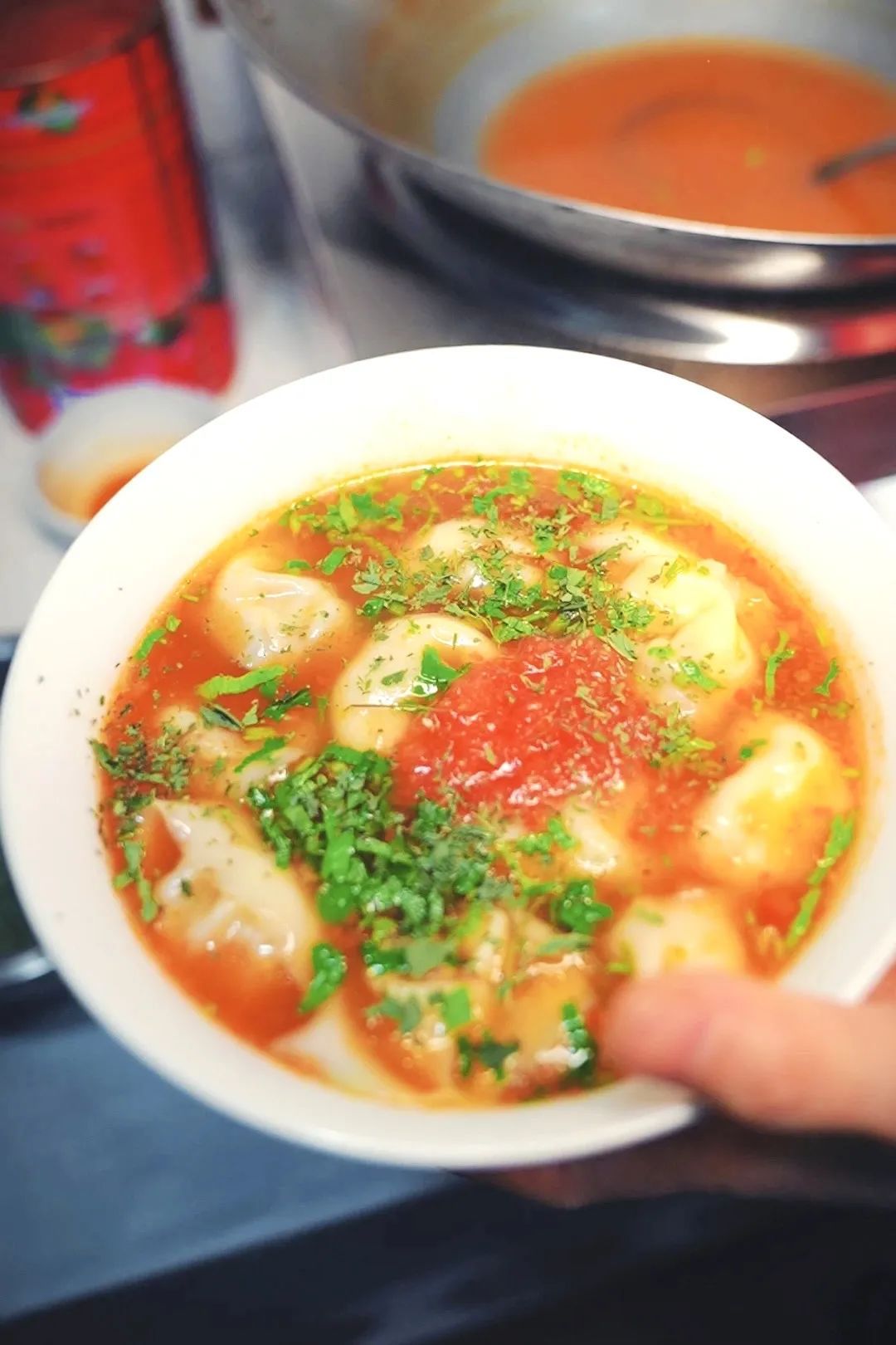 “曲曲”皮薄馅嫩,汤清味美。如何分辨馄饨和“曲曲”呢?面皮对折两边合拢,中间留眼的就是“曲曲”。想吃酸汤版的,提前加入新鲜番茄和番茄酱就行。