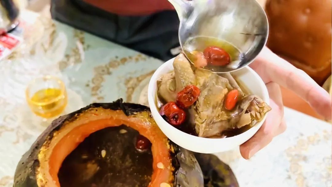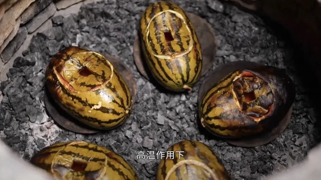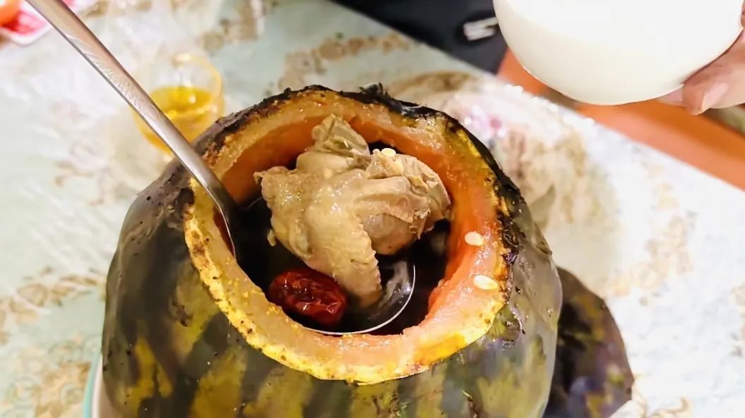 在西瓜顶端开个口,把西瓜瓤掏出,捣一些西瓜汁打底,留下完整的西瓜壳作为“烤箱”。放入洗净的鸽子、葱姜、枸杞、红枣等佐料,封口后上炭慢烤3至4小时。