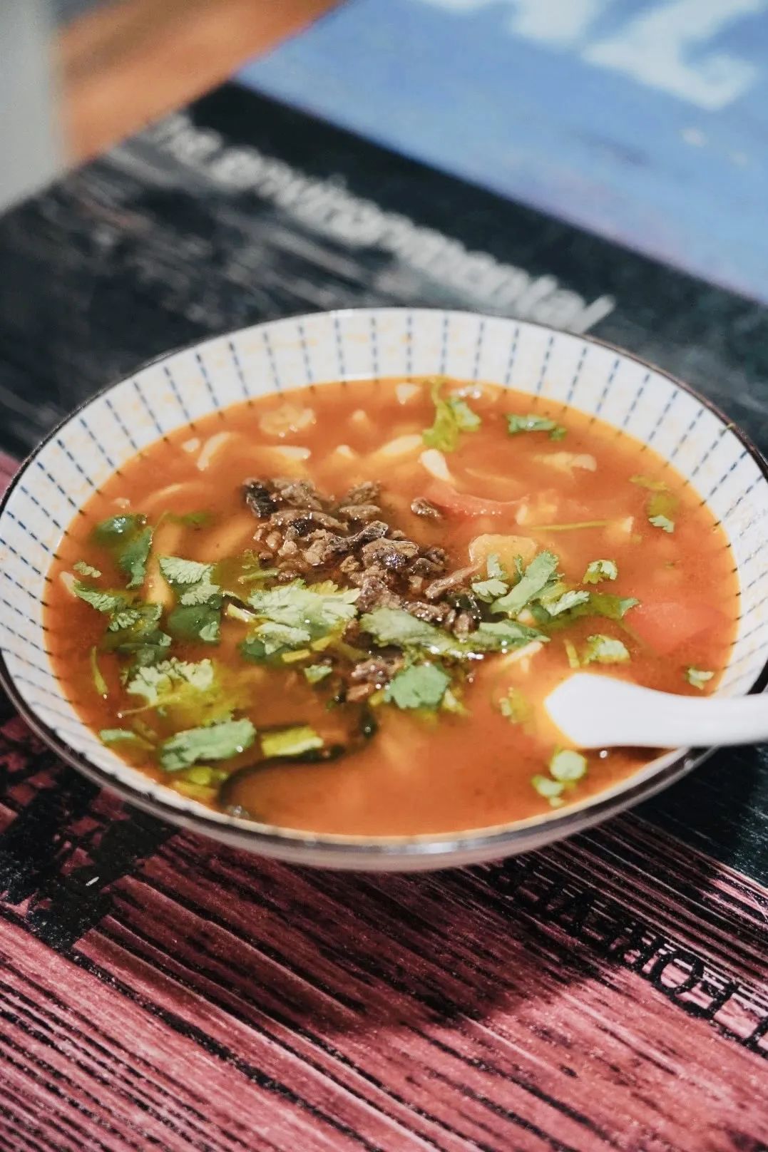 吃前先吸一口泛着油光的肉汤,咸香鲜美,羊肉裹着洋葱的甜味和胡椒粉的辛辣,一口满足。