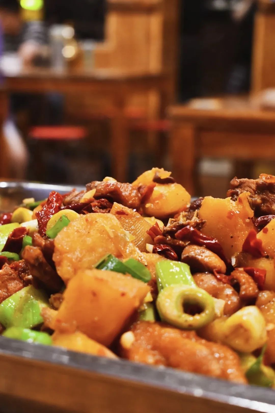 土豆、青红椒、辣皮子、土鸡等爆炒一锅,有肉有菜,轻轻松松做到营养均衡。最后记得加两份皮带面,充分挂满浓稠汤汁,美!