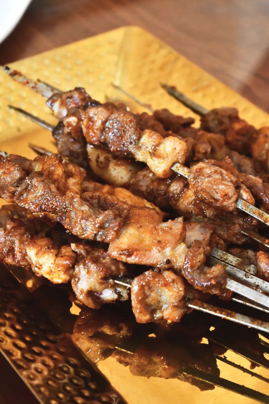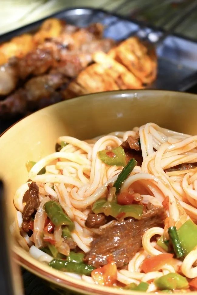 羊肉串配黄面,再浅浅喝点大乌苏、卡瓦斯,在经历了一整天的炎热后,吹着夜风,轻松聊天,好像夜宵时刻的烧烤更香更好吃。
