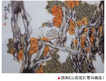 王奇志的花鸟画,除了向日葵系列是他最大的特色外,其他如:石榴、海棠、红柿、梅花、桐花、梨花、桃花等,他都非常擅长,构图巧妙、色彩清新、格调高迈、意境雅逸,在画面恰当得留白,总有一股诗意缠绵其中,尤其花丛叶间时不时探出一只、两只、三只、多只憨呆而可爱的小鸟,虽然不知其名,却让人莫名从心底涌出喜爱之情。