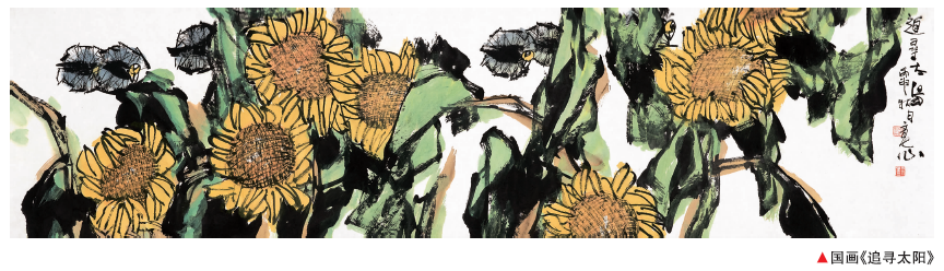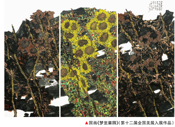 在王奇志的花鸟画里,向日葵不是一味用来膜拜的,瞻仰的,而是与他的生命激情融合的,与他的艺术追求统一的,然后一一化作从他画笔里流淌出来的线条和色彩,成为宣纸上可触可感的国画形象,成为王奇志独特的艺术意象。这与王奇志从小生活在农村有关,他在田间乡野随处可见向日葵,对它再熟悉不过了,日久生情,有情有艺便不在话下了。何况是对于19岁年纪轻轻,就加入了中国书法家协会的王奇志,他从小开始学书学画,加上后天的不懈锤炼,艺术天赋很早便展露出来了。王奇志对向日葵的艺术追求和探索,是从未止步的,他融入了书法的线条和笔触,在中国传统国画里汲取艺术营养,寻觅并探索出自己的绘画语言,色彩时而热烈时而冷静,画面有时简洁有时繁复,却总有诗意的留白,艺思的空间。尤其那幅入过第十二届全国美展的《梦里葵园》,便是其花鸟画艺术最好的诠释。其实从王奇志的向日葵系列标题《追寻太阳》《拥抱阳光》《梦里葵园》《守望家园》《生命礼赞》《太阳的后裔》《太阳每天都是新的》等,都可以看出他是真喜爱向日葵,也深刻理解向日葵的真谛:向日葵,向太阳而生,也向太阳而死,一个太阳的意象,一种生命的激情,一片永恒的信念。一株平凡的植物,却有不平凡的生命意义,被画家喜爱上了,延伸到了画上,赋予了不平凡的艺术价值。一株向日葵,其实也是一个人的缩影,向日葵生命虽短暂,却热烈的追求太阳,追求生命的激情,何况血管里流着血液的人呢!