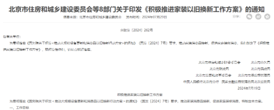 北京市住房和城乡建设委员会官网7月29日消息,日前,北京市住建委等8部门印发《积极推进家装以旧换新工作方案》,积极推进家装以旧换新。鼓励租赁协会引导房地产经纪机构在其经营场所进行家装宣传,带动二手房装修消费需求。