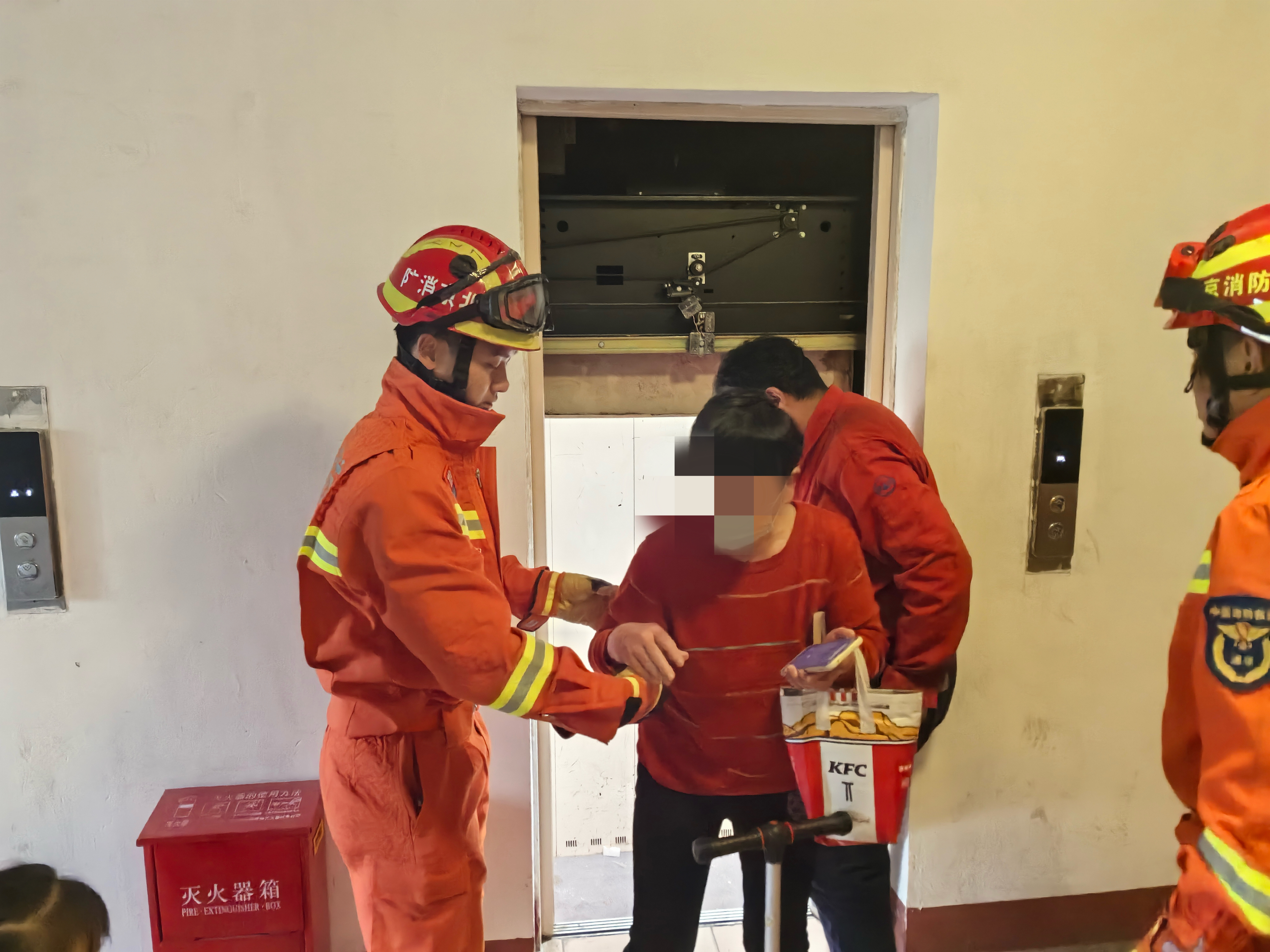 经报警人介绍和现场勘查得知,事故电梯停滞于4层至5层中间位置,一名大人和一名小孩被困其中,消防救援人员向电梯内喊话安抚被困人员情绪,针对现场情况,在确保安全情况下,消防救援人员用电梯钥匙将电梯外门打开,用撬棍配合扩张轿厢内门,创造出救援空间。经过5分钟的紧急处置,成功将2名被困人员救出。