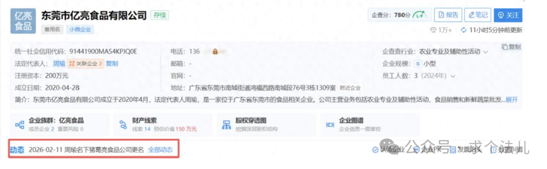 天眼查显示,2月10日,东莞市猪葛亮食品有限公司完成工商变更,企业名称正式更名为东莞市亿亮食品有限公司。该公司成立于2020年4月,注册资本200万元人民币,经营范围涵盖农业专业及辅助性活动、智能农业管理、初级农产品收购等。