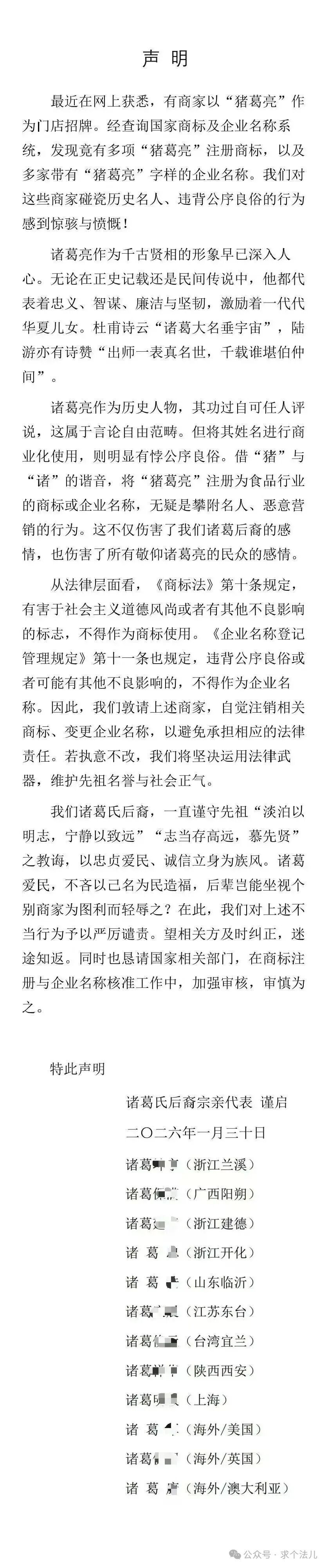1月31日,自称诸葛亮后裔的人士发表联合声明,明确指出利用“猪”与“诸”谐音注册“猪葛亮”为商标或企业名称,属于攀附历史名人、恶意营销的行为,不仅伤害了诸葛后裔的感情,也伤害了所有敬仰诸葛亮的民众的感情。随后有诸葛亮后人补充表示,经查询发现全国已有近200家主体注册“猪葛亮”相关商标或使用该名称作为企业字号,担心此类谐音梗滥用会误导公众、损害诸葛亮的历史形象,影响传统文化传承,其核心诉求是希望相关部门审慎审核此类注册申请,并撤销已注册的相关商标。