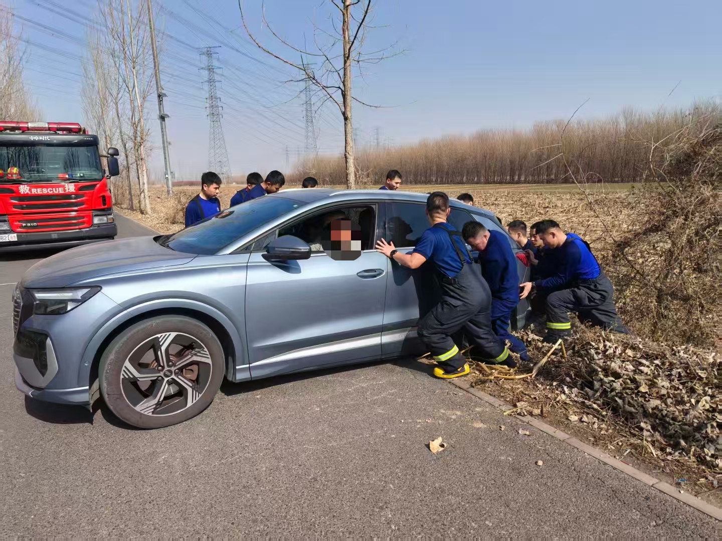 了解情况后,张笑天迅速观察车辆受困状况。由于路旁的泥土松软,单靠车辆自身动力已无法脱困。他立即组织现场的消防救援人员,决定采取人力推车的方式协助车主。