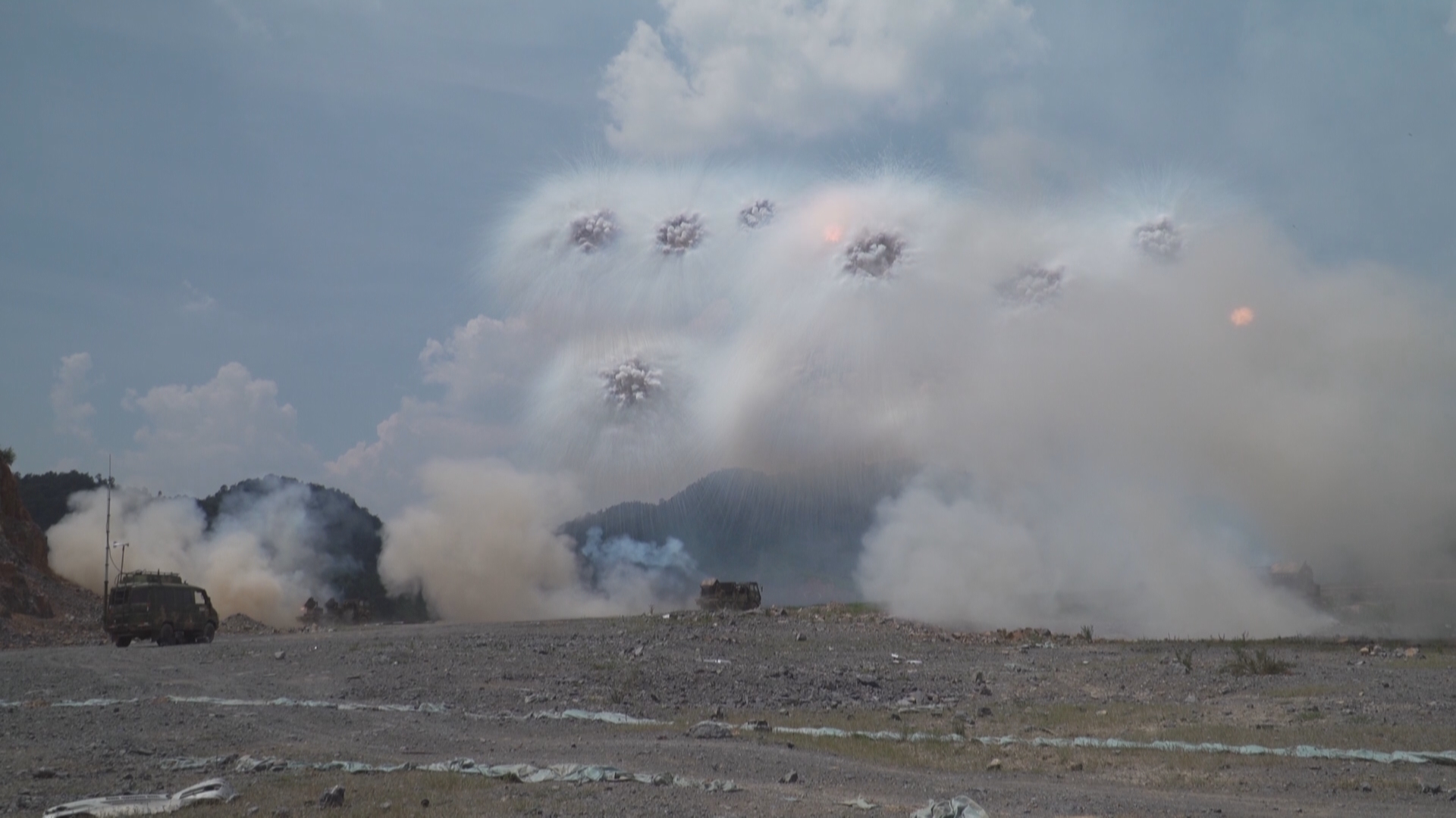 记者在现场看到,随着指挥员一声令下,三辆空中烟幕施放系统发射车对来敌方向实施联动扫射,随即36枚烟幕弹在20秒内营造出一面宽130多米、高80多米的烟幕遮障,成功对我重要军事目标进行烟幕伪装。